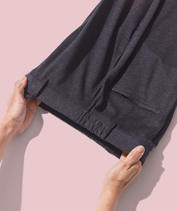 ONLY : レディースのパンツは、ウエスト部分が伸び縮みする使用になっているため、長時間着用しても快適です。また、ジャージーの弱点である膝抜けもしにくく、センタープレスも特殊加工によってキレイなラインがずっと持続します。