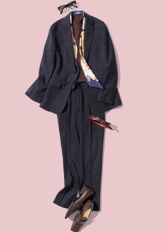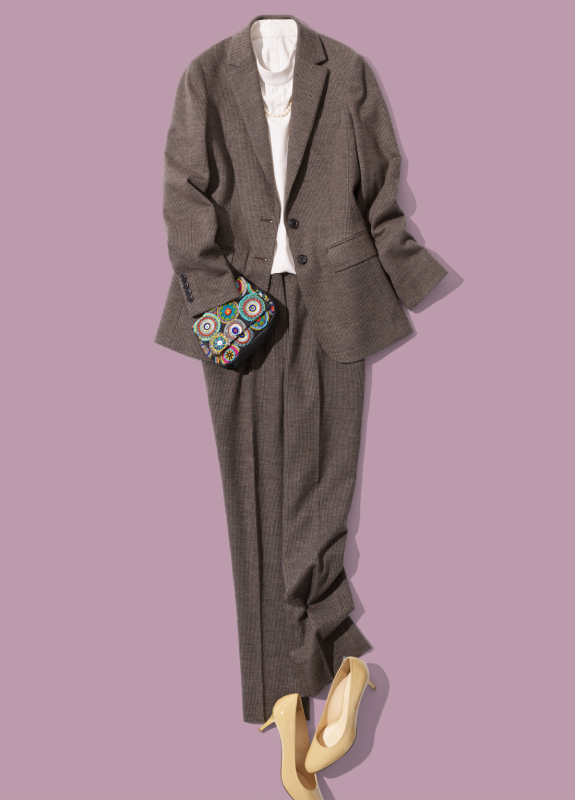 「パーティシーンには、フランネルスーツを思わせるブラウンのメリノジャージースーツがぴったり。白いモックネックのカットソーとベージュのパンプスでナチュラルにまとめながら、ビビッド柄のバッグでアクセントを効かせました」