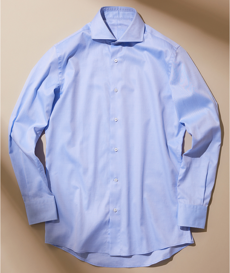 縫い上げたのちに溶液へ浸して形態安定加工を施すことにより、優れた防シワ性を備えるガーメントディッピングシャツ。ノンアイロンに加え、一日着てもシワになりにくく、気になる肘部分のシワも軽減。それでいてピュアコットンの100双糸で織られているため、ナチュラルな着心地や高級感ある艶も十分です。