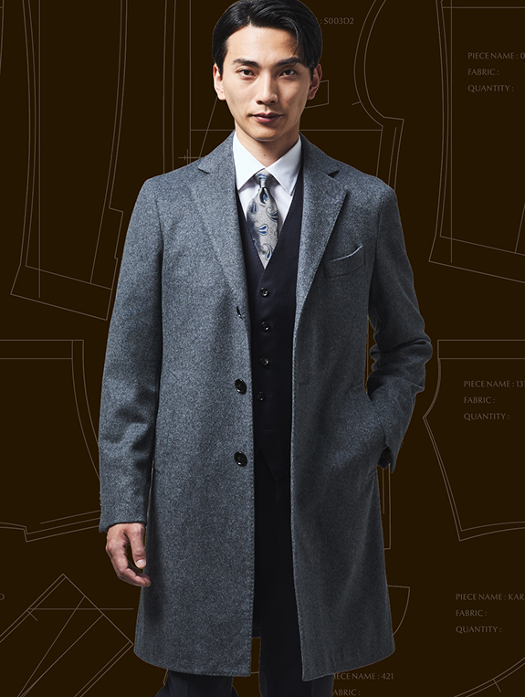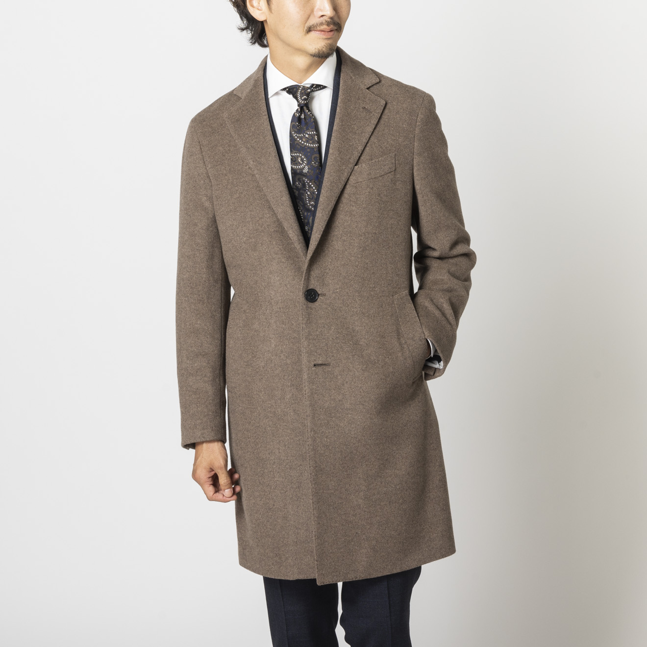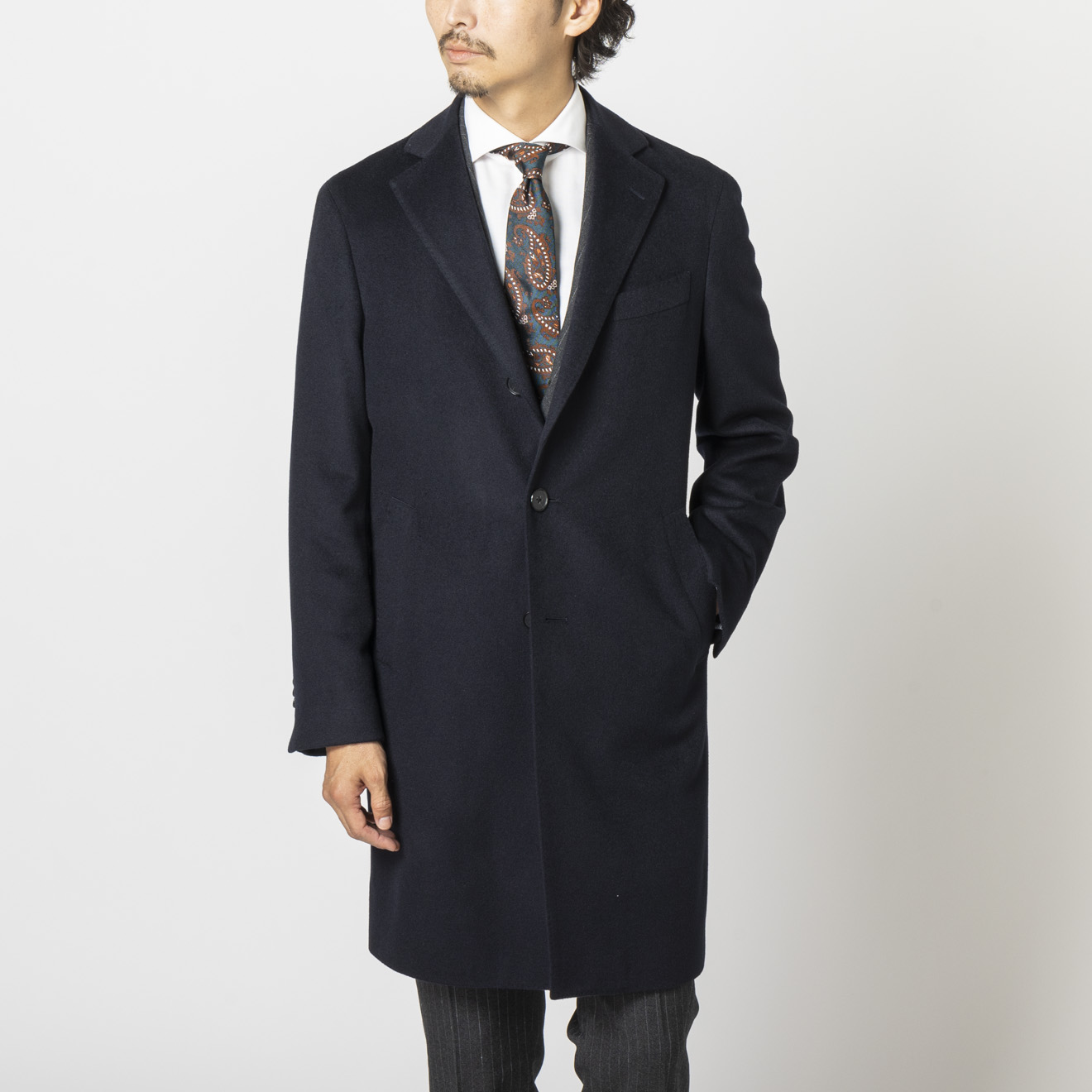 世界三大高級繊維のひとつ、カシミヤ。そのなかでも厳選した細番手の原毛を100%使用し、一着ずつ丁寧に仕立てたチェスターコートです。触れた瞬間にわかる滑らかな風合いと、上品な光沢。軽さと保温性を兼ね備え、冬の空気さえも柔らかく包み込みます。立体的な肩まわりと胸のラインは、スーツ工場ならではのテーラード設計。前肩のカーブやラペルのロール、裾にかけてのドレープに至るまで、一切の無駄がない構築美で魅せる1着です。
