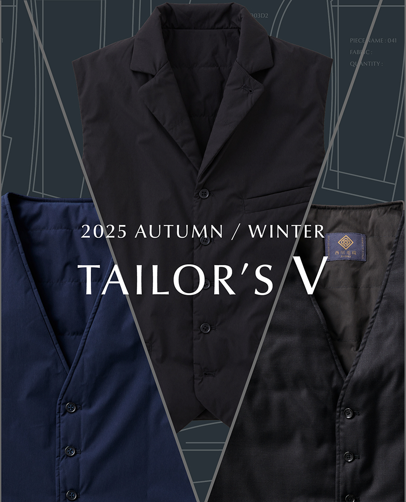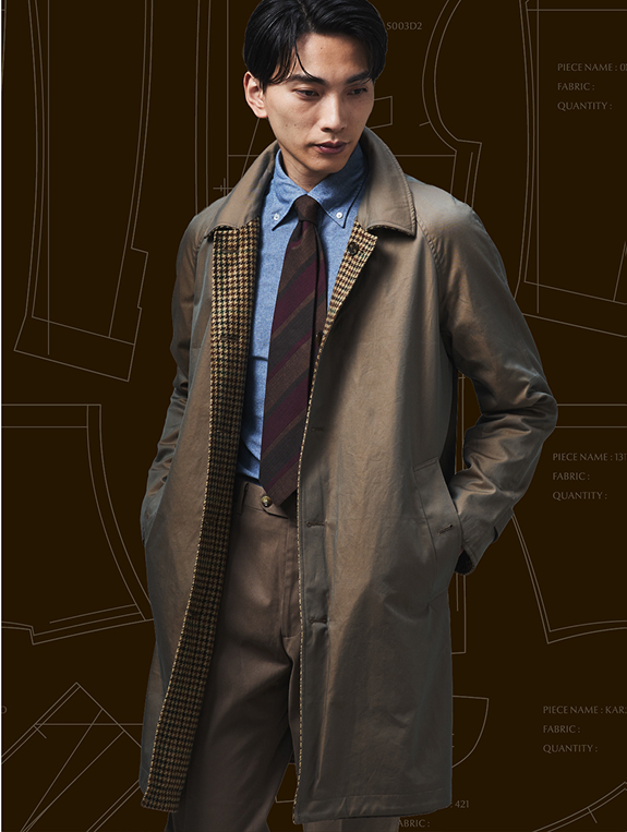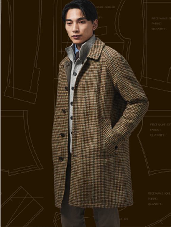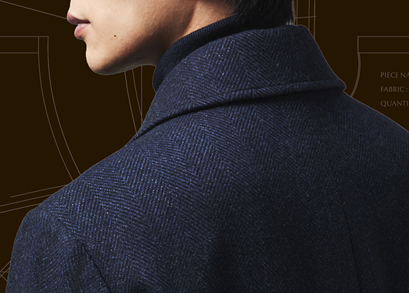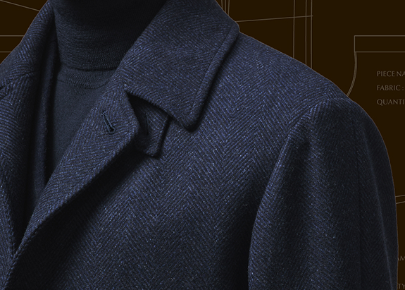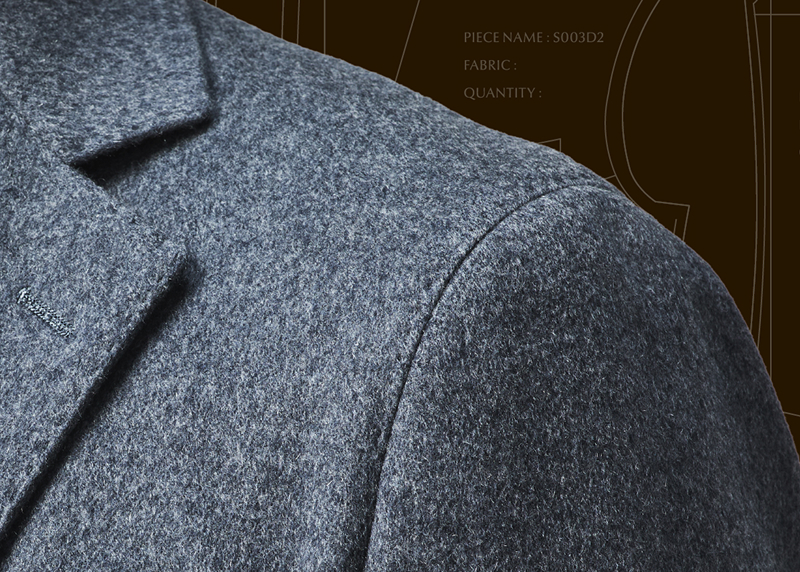 スーツ工場で培われたショルダーライン設計をそのまま応用。やや前振りの袖付けと、肩先にほんのわずかな丸みをもたせることで、動きやすさとエレガンスを両立しました。パッドを極限まで薄く仕上げたアンコン仕立ては、重ね着しても突っ張らず、体の動きに自然に追随。これこそスーツ屋が仕立てるコートの真価です。