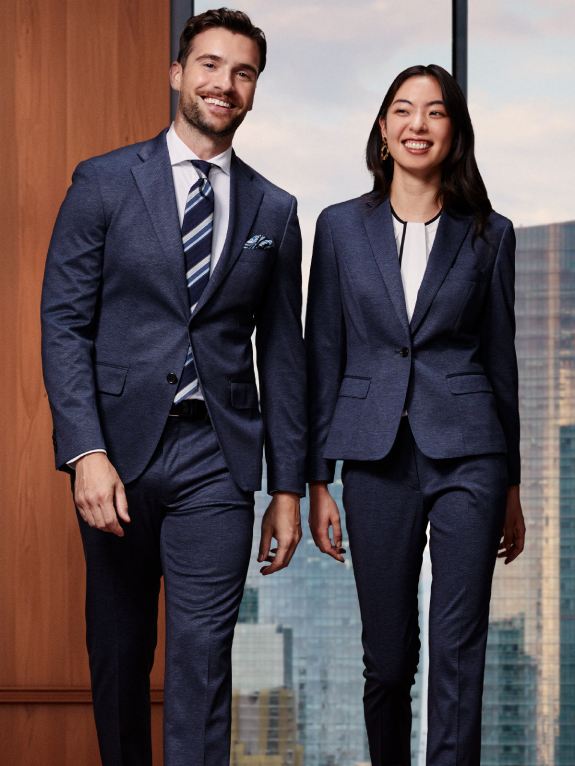 ネイビーのバーズアイ素材を用いた新作は、軽量でシワになりにくい合繊生地ながらも、ウール見えする上品で高級感のある表情。まさしく出張にうってつけなセットアップです。 メンズ・ウィメンズ同生地でご用意。またインナーやパンツを変え、ビジネスカジュアルな装いにスタイルチェンジも可能です。