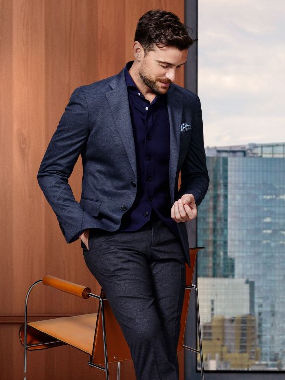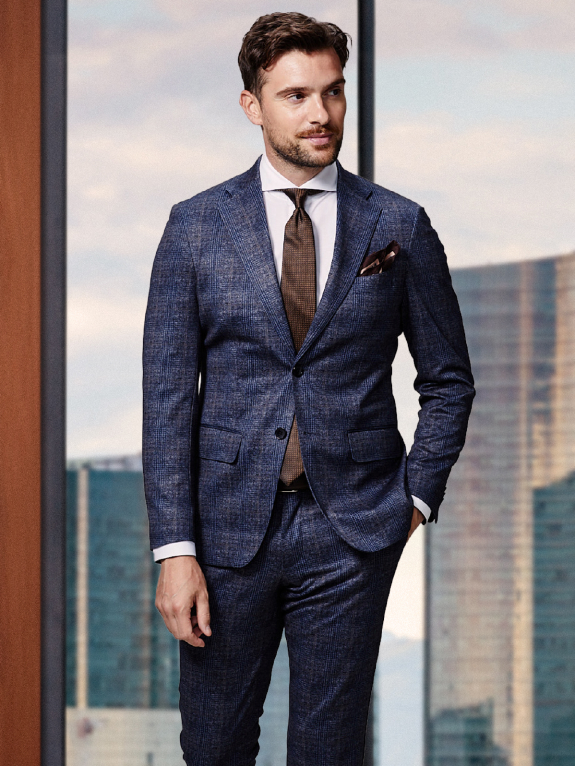 ネイビーを基調としたグレンチェック柄は、英国調の趣とモダンさを兼ね備えた一着。白シャツにブラウンのネクタイを合わせ、落ち着いた中にも柔らかな色気をプラス。ブラウン系のレザーシューズを合わせれば、ビジネスシーンはもちろん、ドレスコードのあるカジュアルな集まりにも対応可能です。ストレッチ性と防シワ性に優れたジャージー素材は、出張や長時間の移動も快適にサポートします。