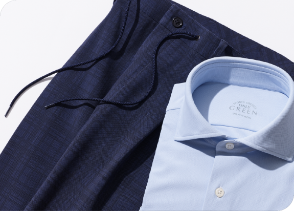 吉野:ドローコード付きのパンツは本当に重宝しますよね。しかもオンリーさんのパンツはシルエットもきれいなので、今シーズンは、パーカーやラガーシャツなんかを合わせて、ちょっとプレッピーな着こなしに取り入れるのもいいと思います。しかもこのオンリー グリーンのシャツもすごいですね。めちゃくちゃ伸びる。せっかくジャケットとパンツにストレッチが効いていても、シャツが窮屈だと台無しになってしまいますが、このシャツならセットアップの快適性をさらに増してくれます。仕事帰りに、打ちっぱなしも行けるし、バッティングセンターも行けちゃいますね。
