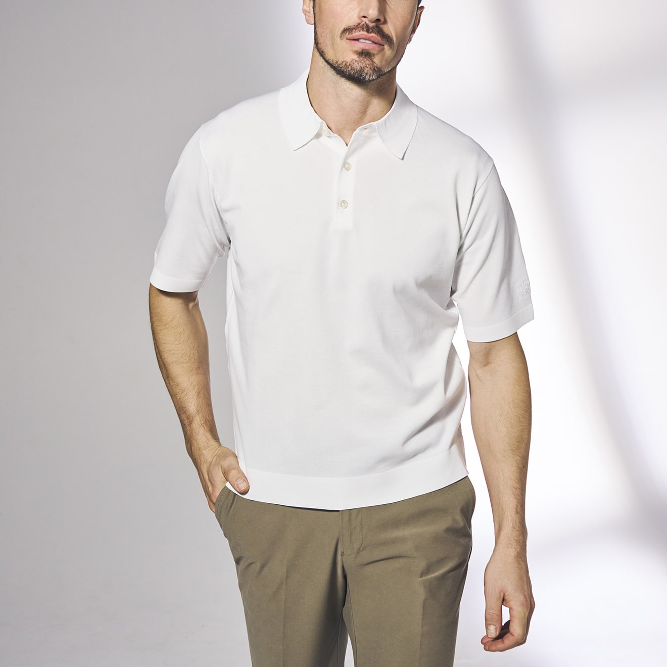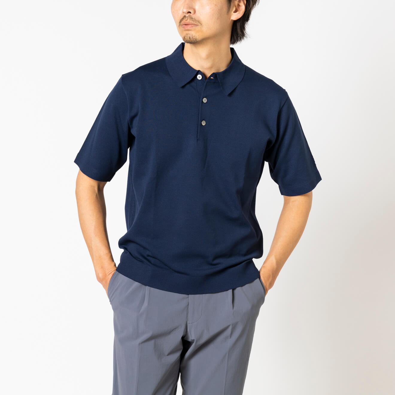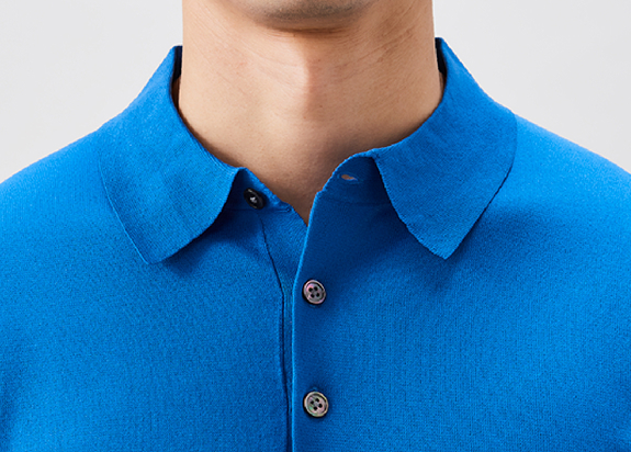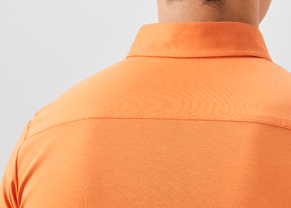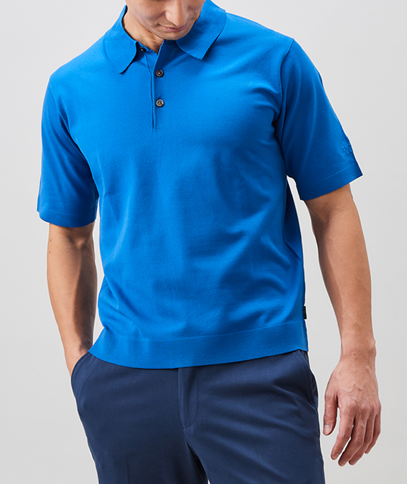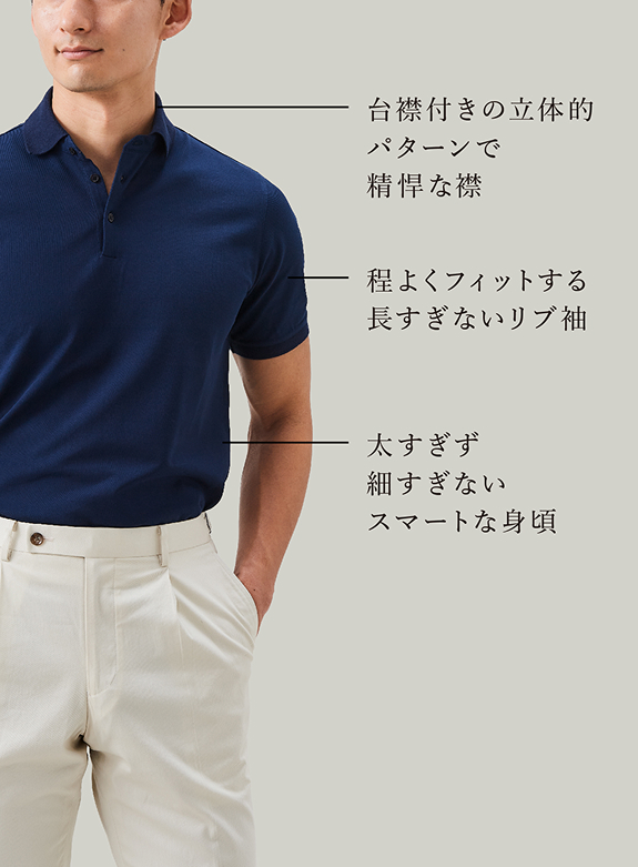 ポロシャツながら襟はドレスシャツのように立体的。逆に袖はスポーティにフィットし、ボディのシルエットも程よくスマートです。