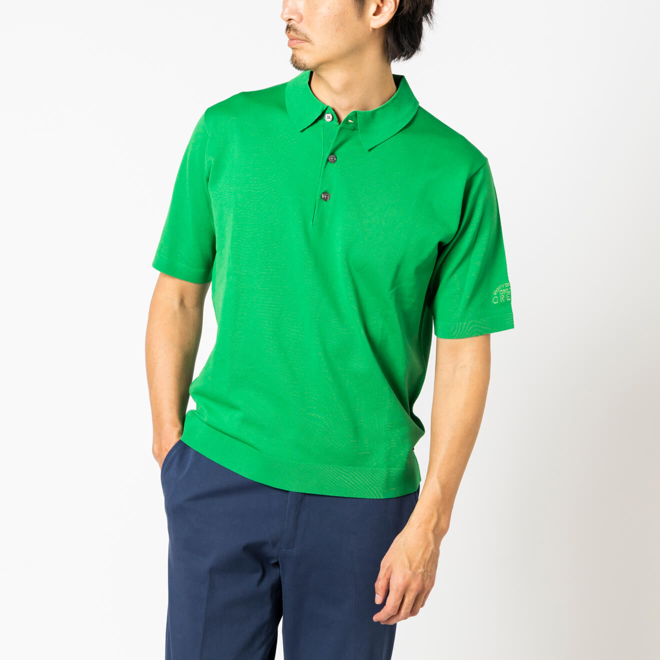 一見コットンのようなポリエステルジャージーを用いた、オンリー グリーンのニットポロ。ストレッチや吸湿速乾などの機能性に加え、ポリエステルの発色を生かした鮮やかなカラーバリエーションも揃います。台襟風の立体編みの襟は、一枚で着ても凛々しく、ジャケットとの相性も申し分なし。