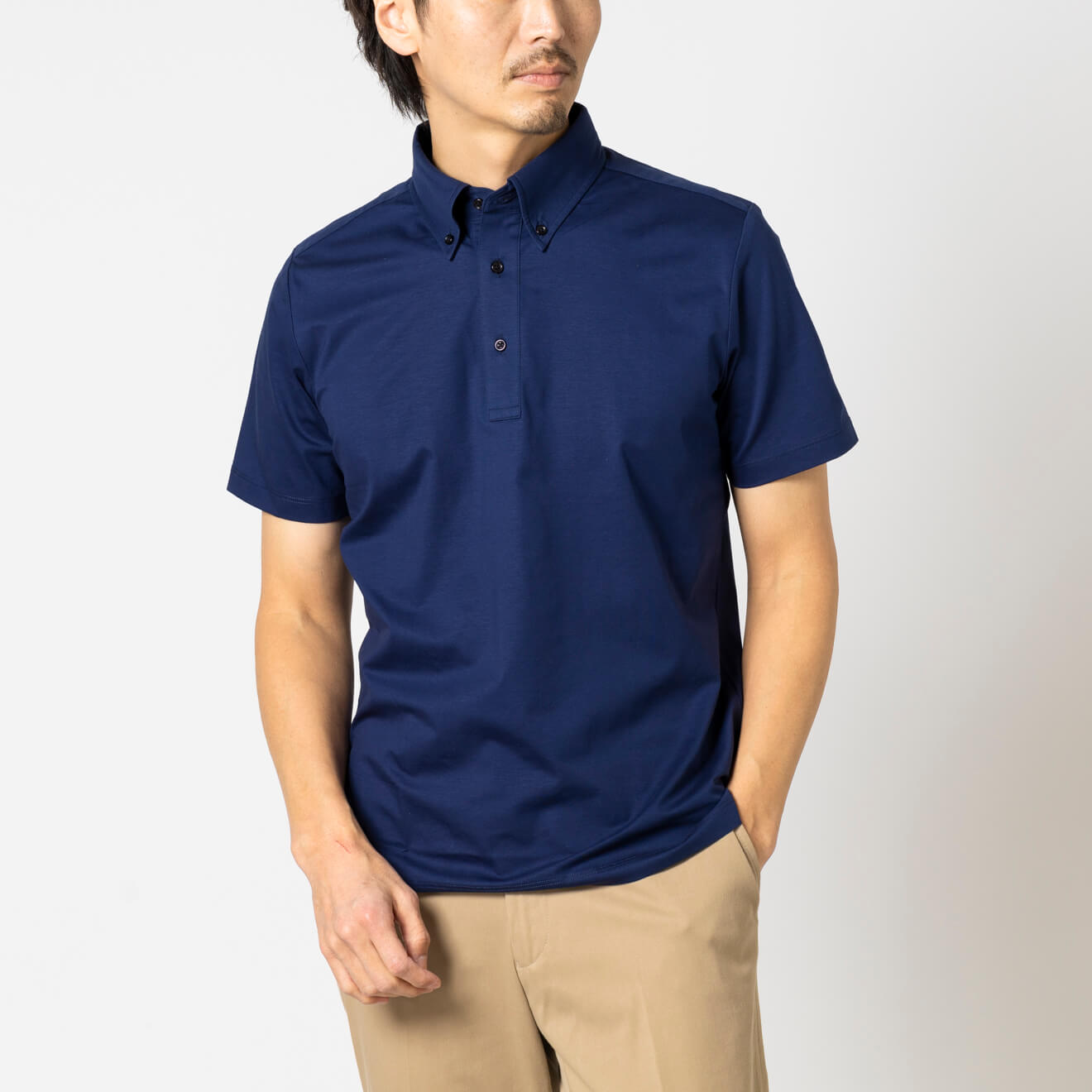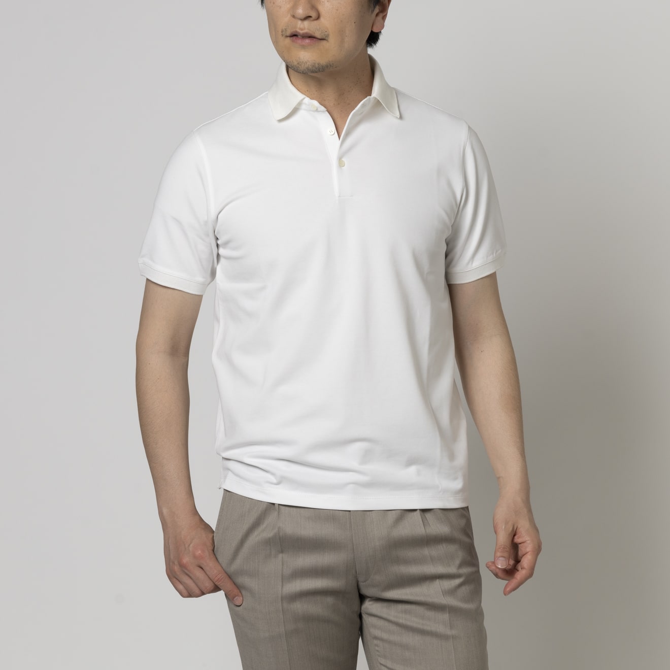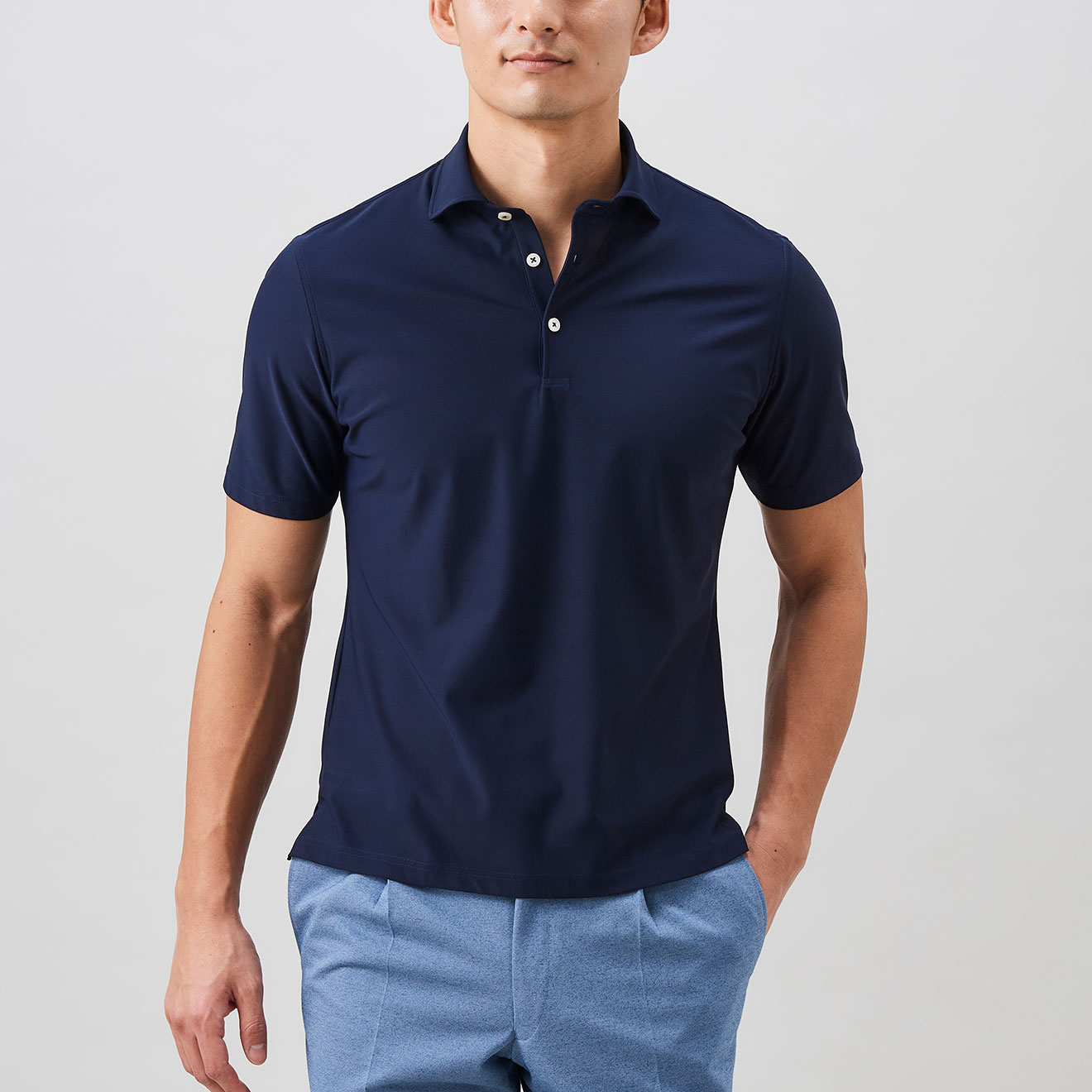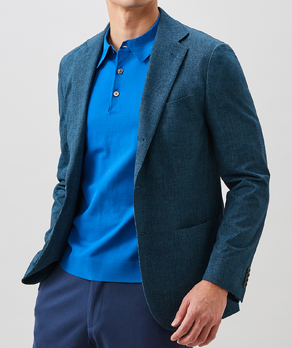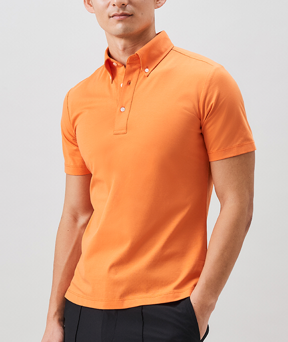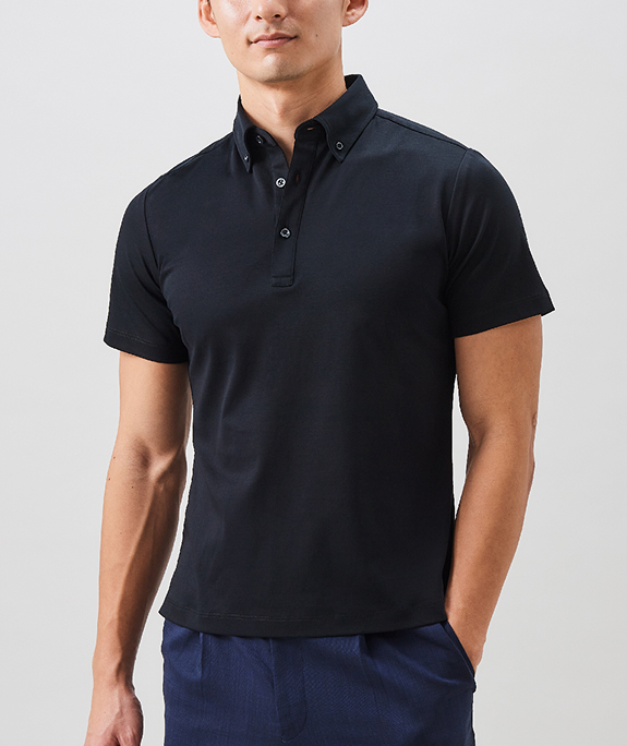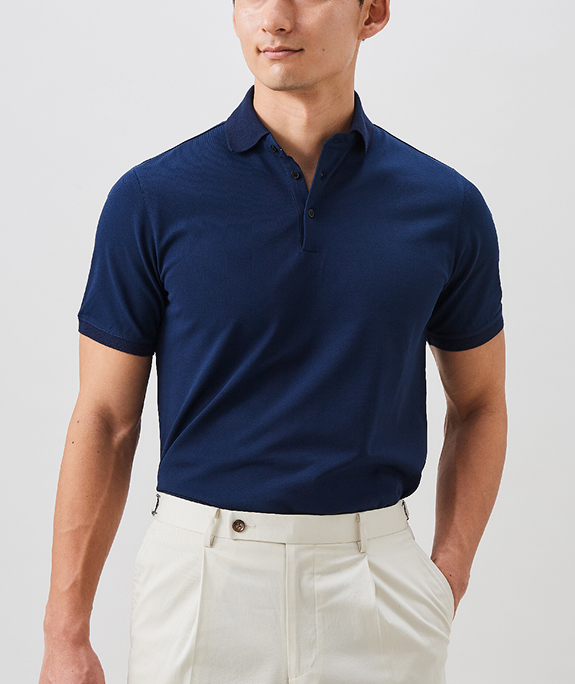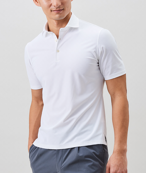 進化した高機能ビジネスポロアイスコットン製の鹿子素材を用いたポロシャツは、接触冷感機能で夏場でも涼やかな着心地。さらりとした肌触りの鹿子織りながらも、組織が細かいためスポーティにならず、ビジネススタイルに最適なドレッシーさのある表情です。立体的な襟はジャケットを羽織った際も美しく収まります。