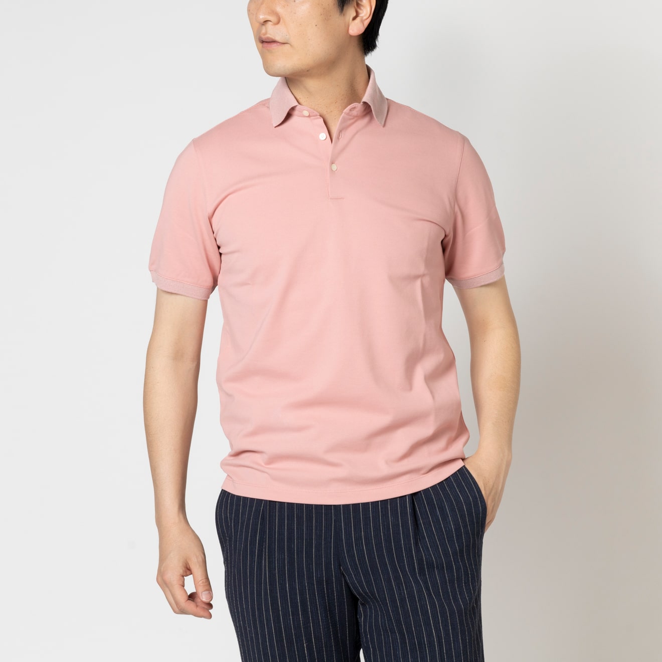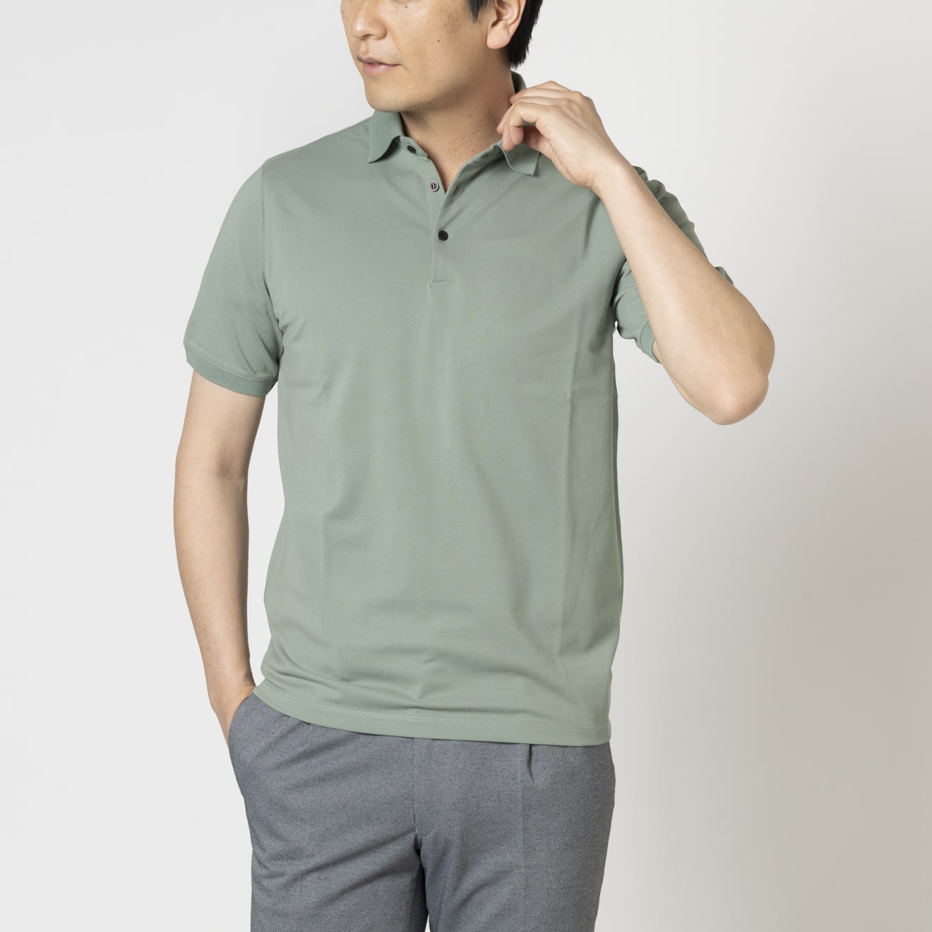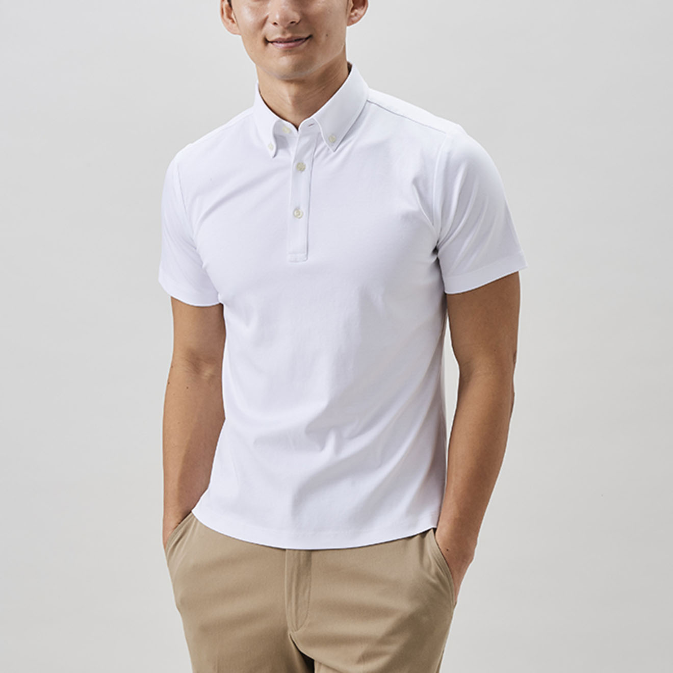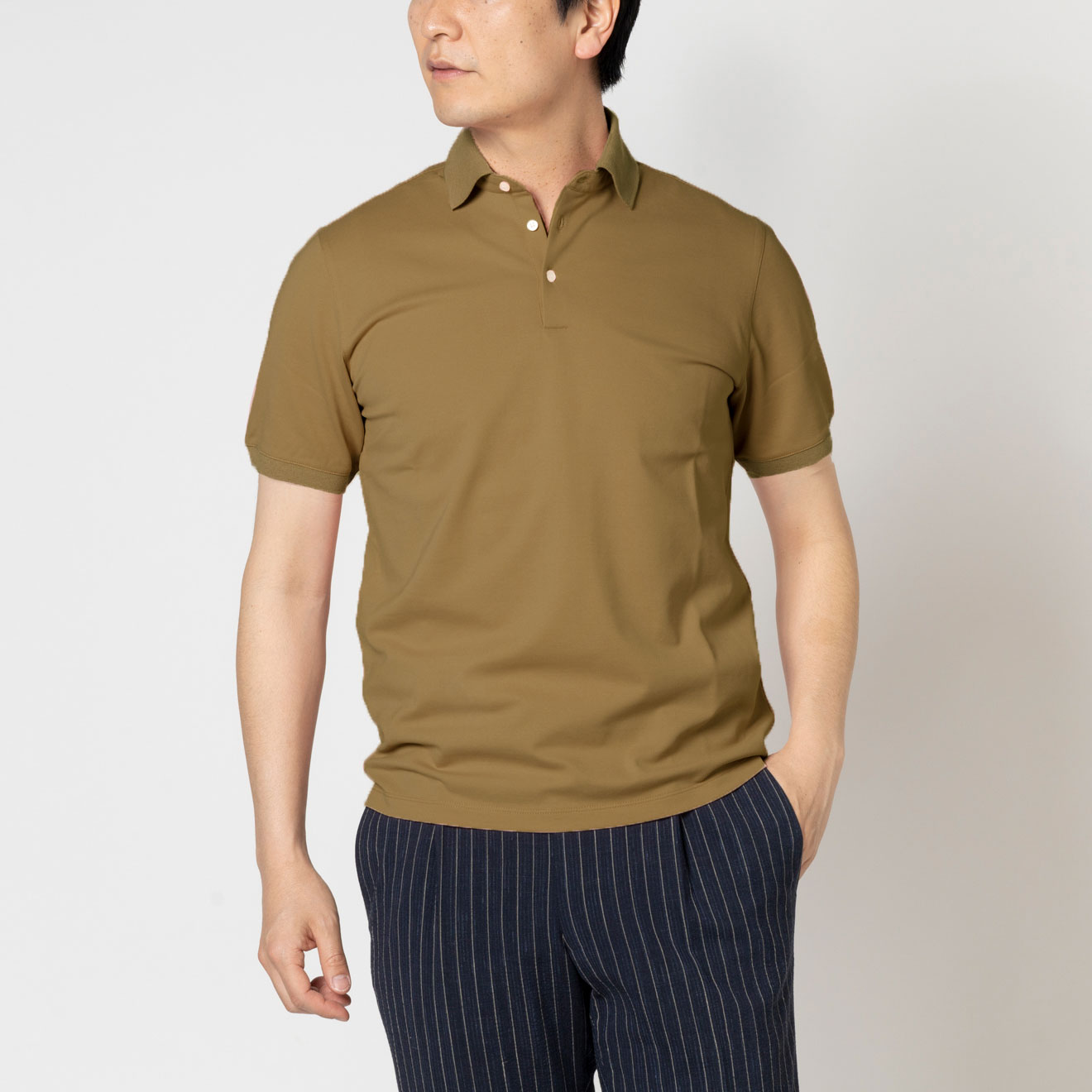 進化した高機能ビジネスポロアイスコットン製の鹿子素材を用いたポロシャツは、接触冷感機能で夏場でも涼やかな着心地。さらりとした肌触りの鹿子織りながらも、組織が細かいためスポーティにならず、ビジネススタイルに最適なドレッシーさのある表情です。立体的な襟はジャケットを羽織った際も美しく収まります。