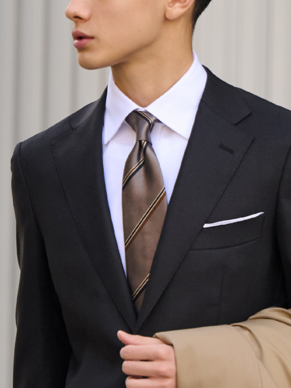 - 落ち着きのあるチャコールグレーのスーツと相性のいいブラウン系のネクタイ。レジメンタルストライプ柄で真面目さをキープしながらも洒落た印象で胸元を引き締めます。ファーストスーツを感じさせない佇まいの完成です。