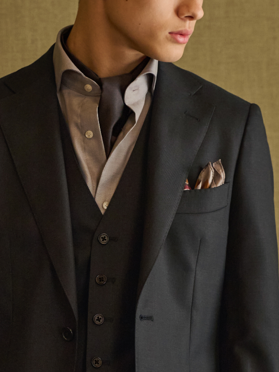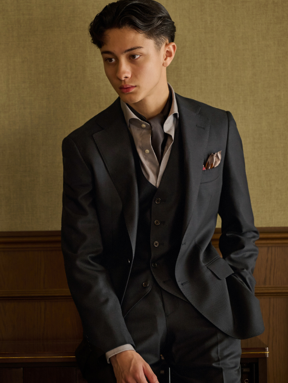 - グレーのカラーシャツにチャコールグレーのスカーフタイで胸元に色気を醸します。チャコールグレーのスーツに同生地のベストを合わせ、全体をワントーンコーディネートに。結婚式の二次会やパーティーに最適なエレガンスかつモダンなスタイルです。