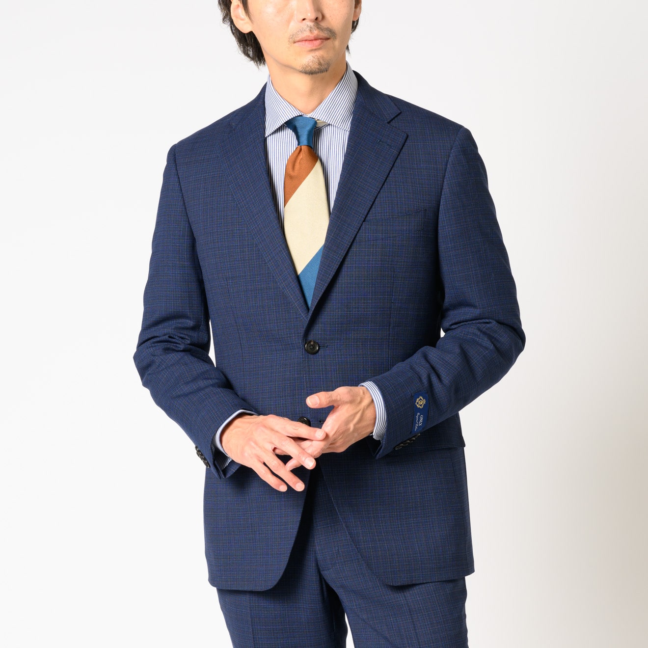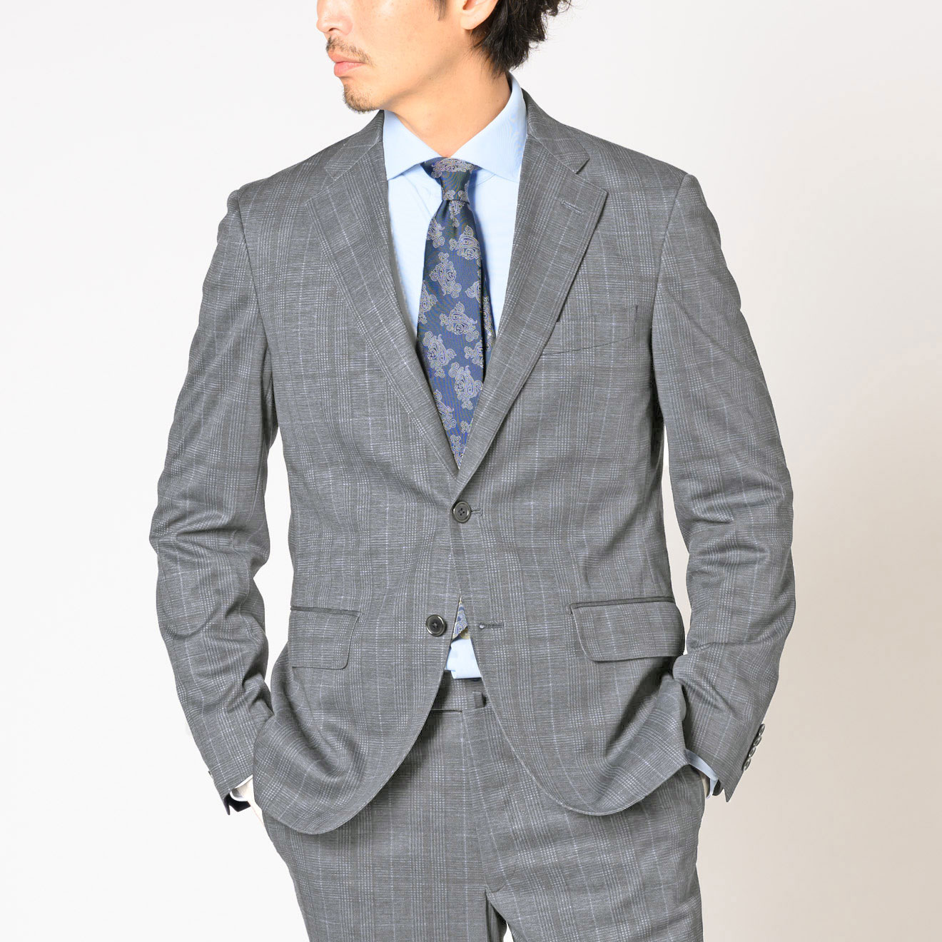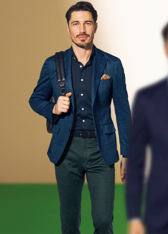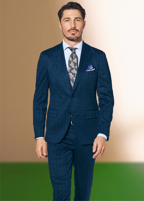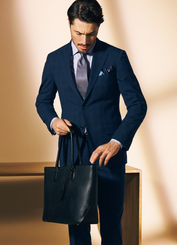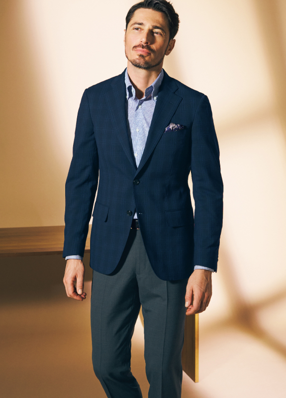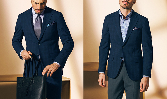 出張を想定したスーツ+単品グレーパンツのセットにより、2通りの着こなしができる「トラベラー」。ネイビーチェックの新作は、軽やかな2WAYストレッチ生地で着心地も申し分なしです。