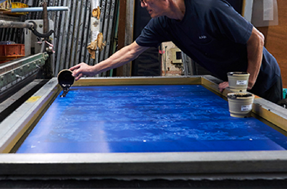 大本染工の誇る高度なプリント技術により、編み物(ジャージー)とは思えない織り物(ファブリック)のような表情。色柄に奥行きがあり、高級感も十分です。