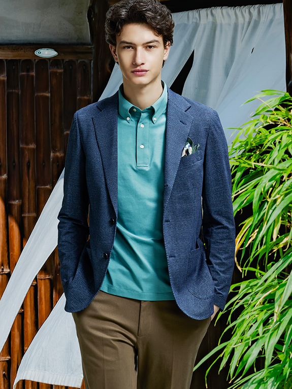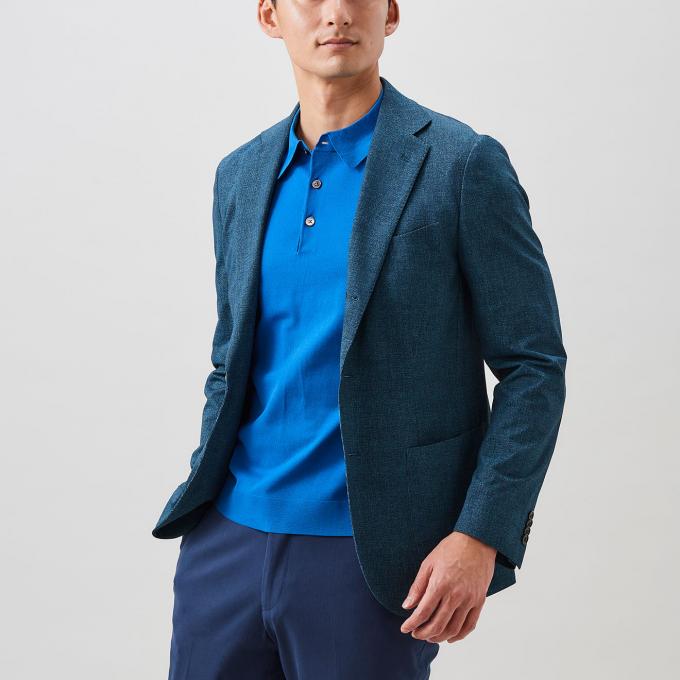 仕事帰りに軽いスポーツをこなせる、アクティブなビジネスアイテムが揃うオンリー グリーン。新作のジャケットは、抜群の伸縮性を備える軽量ジャージーにデニムのようなテクスチャーをプリント。接触冷感も備え、家庭での洗濯も可能な高機能ジャケットです。