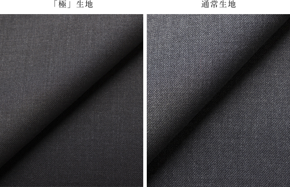 2025年春夏より、極は綾織り生地を定番化。発売から作りつづけている「チャコール」は、通常の生地と比べ、深みと艶を備えたフォーマルな表情。さらにはナチュラルストレッチでビジネスからセレモニーまで対応する、大人の無地として支持され続けています。