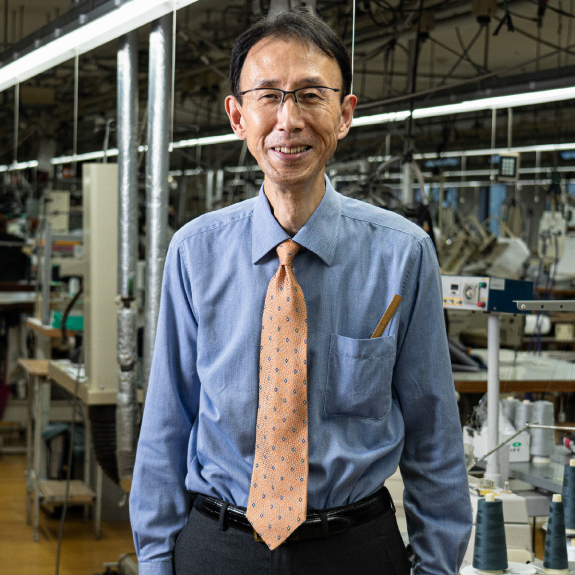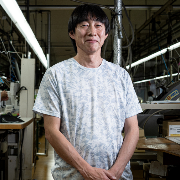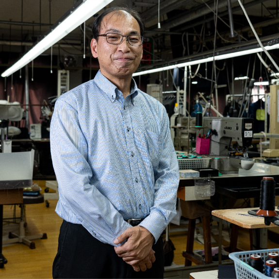 いわもと まさや●武雄市出身。縫製の工程全体を手がけるエキスパート。人体の曲線に沿う立体縫製は、工場内でも右に出る者がない。大の釣り好きで、休日は自身の船で海へ出る。