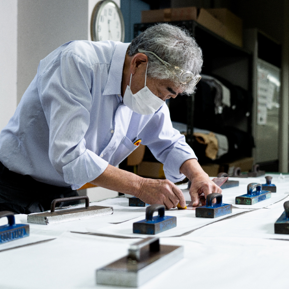 スーツの縫製は、ただ生地同士をきちんと縫い合わせればいいというものではない。着心地がよくなるように縫い目を緻密に、かつ人体の曲線に沿うよう立体的に縫い上げる必要があるのだ。岩本さんは縫製工程の全体を見ているが、おもに手がけるのは、身頃や袖といったパーツをひとつにまとめて縫い上げる「本流(ほんりゅう)」と呼ばれる工程。 「頭の中で人体のカーブをイメージしながら縫うのが大切です。さらに湿度や糸によって変化する生地の収縮率を計算したり、箇所に応じてテンションを調整したりする必要もあります。何より本流はみんなが縫い上げたパーツをひとつにする重要な工程なので、長年やっていても緊張感を感じます」 各工程のミスを見つけるのも岩本さんの仕事。 「とにかく何度もチェックを繰り返すこと。これが品質の向上につながります」