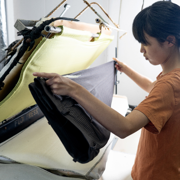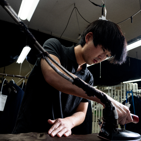 縫製後のスーツをアイロンでプレスする工程は、シワを伸ばして生地の目を整えるだけなく、人体の曲線に沿うように立体感を生み出す重要な工程だ。オンリーファクトリーでは、パーツごとにアイロンでのプレスを行い、立体感を高めているが、福田さんの役目は「お化粧(おけしょう)」と呼ばれる最後の仕上げ。 ベテランの職人のもとで技術を磨き、7年目にこの役目を任された。この作業には、手先の技術はもちろん、頭の中で人体の構造を正確にイメージできる感覚が欠かせないという。 「立体感は着心地や見栄えを大きく左右する要素です。私たちの業界では、スーツの生地の目がきりっとして見栄えがいいことを“ツラが立つ”というんですが、そんなスーツを目指して仕上げています」