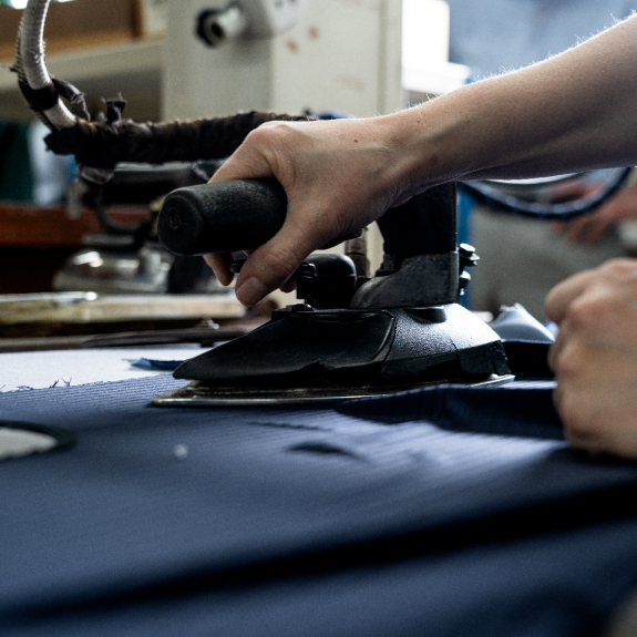 - 手間のかかる工程だが、マシンを使ったプレスよりも、手持ちアイロンのほうがより人体の曲線に近くなるという。「オンリーのスーツは立体感が生み出す見栄えのよさもウリのひとつ。特にお客様の目につきやすい衿や袖の仕上げには気を遣います」