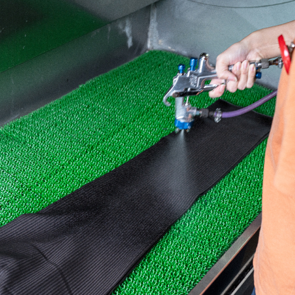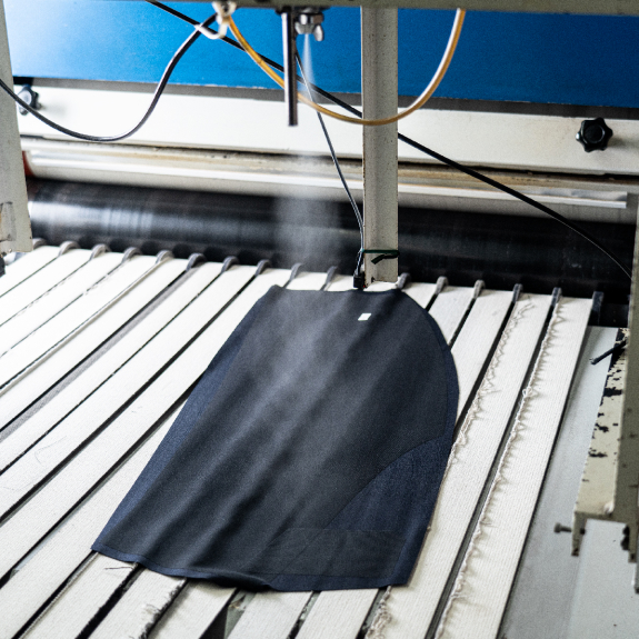 - 裁断後の生地に純水を吹きかける。「このひと手間が仕上がりに影響します」