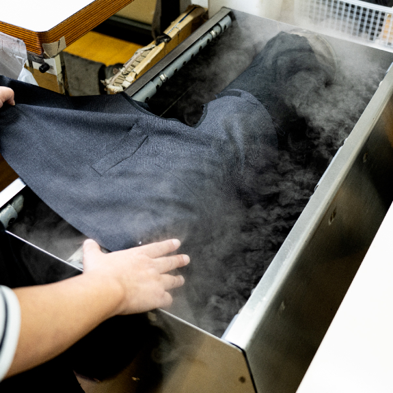 湿度へのこだわりは、オンリーファクトリーの最大の特色だ。 「生地は乾燥すると状態が不安定になり、そのまま縫製すると、型崩れや縫製不良の原因になります。たとえば、雨の日などに生地が伸びると、芯地とズレて、型崩れが起きることも。ですから、スーツを作る段階で、生地を念入りに加湿してリラックスさせておくことが大切なんです」 そのため、工場内の湿度は特殊な加湿器によって常に60%に保たれている。これは工場の絶対ルールで、喜多さんは20年にわたって湿度の管理を行っている。 「工程でも、縮絨をはじめ、生地の裁断後、芯据え(前身頃と芯地をつける作業)の前、見返し据え(前身頃と見返しを仮留め)の前という4工程で加湿を行っています。こうすることで、生地の豊かな風合いが際立つ、型崩れのしにくいスーツが出来上がります」