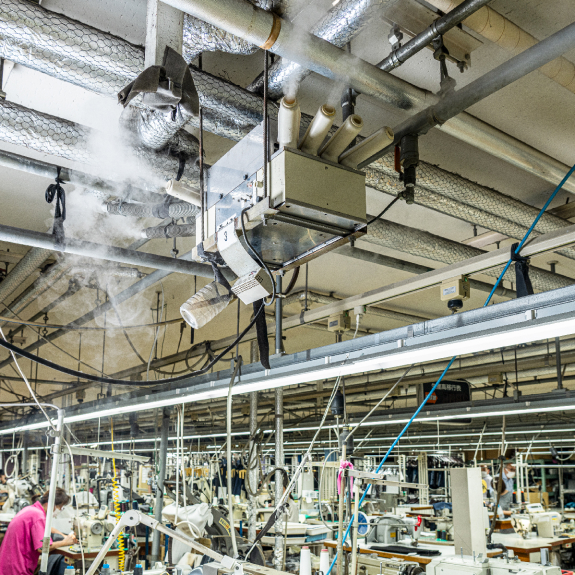 - 工場内の加湿には、半導体の工場で使われるウェットマスター社の超音波加湿器を使用している。「湿気の分子がタバコの煙より細かいため、スーツや機械に水滴がつきません。天井に10台設置しています」
