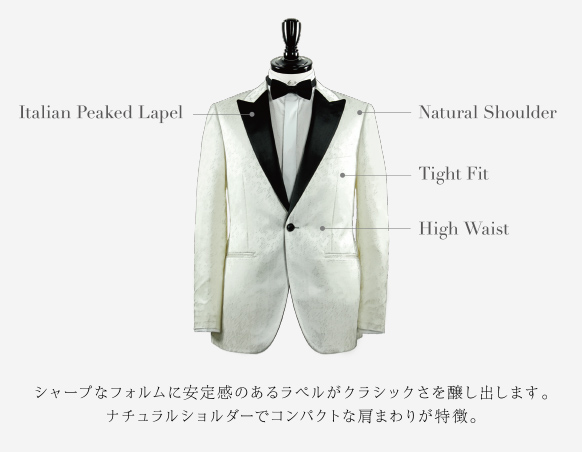 拝絹付きラペルはエレガントなタキシードジャケットとして、