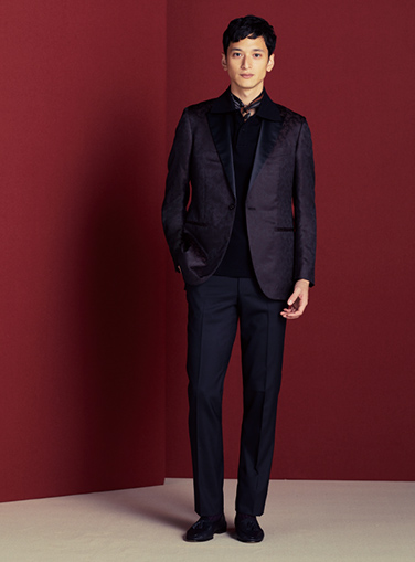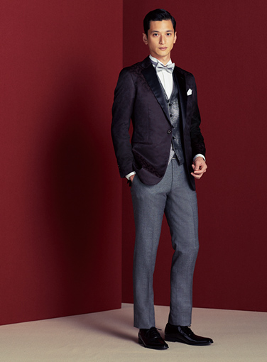 拝絹のついたタキシードジャケットに華やかなベストと喋タイを合わせれば、あらゆるパーティシーンで一目置かれるスタイルに。