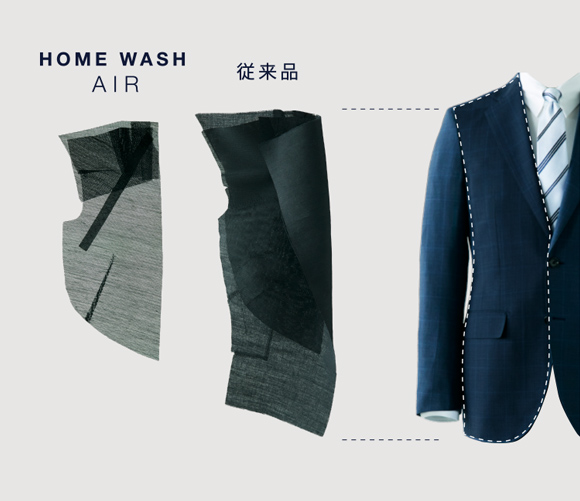 ホームウォッシュ エアのためだけに開発した軽量ウールポリエステル生地は、1mあたりわずか165g。また芯地にはメッシュ素材に樹脂加工を施すことで通気性と軽量性、さらに高級な天然毛芯に匹敵するハリを備えるオリジナル芯地を採用。当社従来スーツと比較して、500g軽い(サイズ 175A)という超軽量を実現しました。