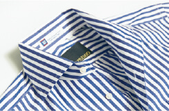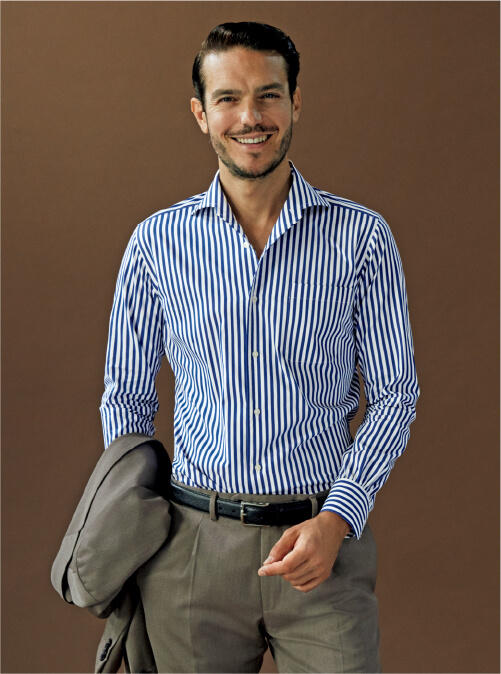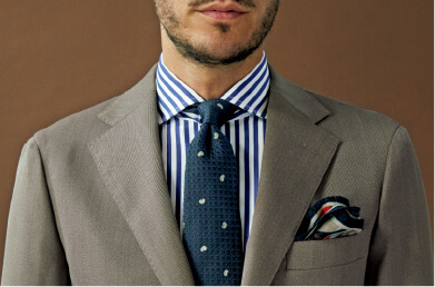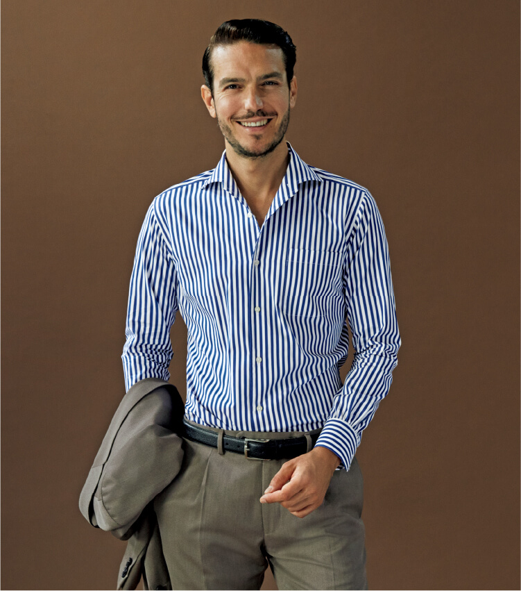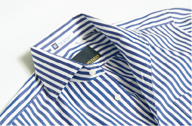 通常のワンピースカラーに台襟を表側から取り付けた、これまでになかったデザインであり、ノータイでボタンを開けると襟が優美にロールして上品なリラックス感を演出。それでいて台襟があるので、タイドアップした首元も凛々しくきまります。