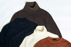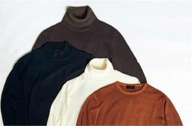 すっきりしたシルエットでジャケットを羽織ってももたつかず、コスパも抜群です。上品なハイゲージのタートル、モック、クルー、カジュアル感のあるミドルゲージのタートルをご用意。