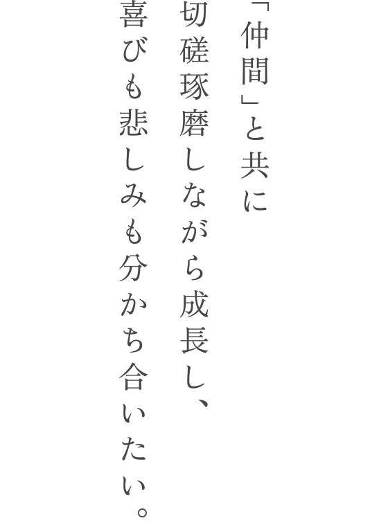 本当の仲間というのは楽しく笑っているだけでは無く、互いに切磋琢磨しながら成長し、喜びも悲しみも分かち合うものです。積極的に提案し、自発的に行動する、当社ではそんな次の世代を担うチャレンジ精神が旺盛な仲間を求めています。