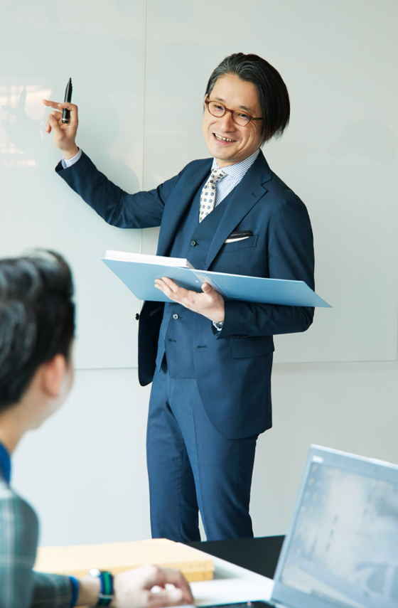 説得力が必要なプレゼンや商談などの場では、夏でもジャケットを羽織って。コットンライクな素材は普段のスーツスタイルより少しカジュアルな印象を与え、夏のクールビズの中でも爽やかな印象になります。
