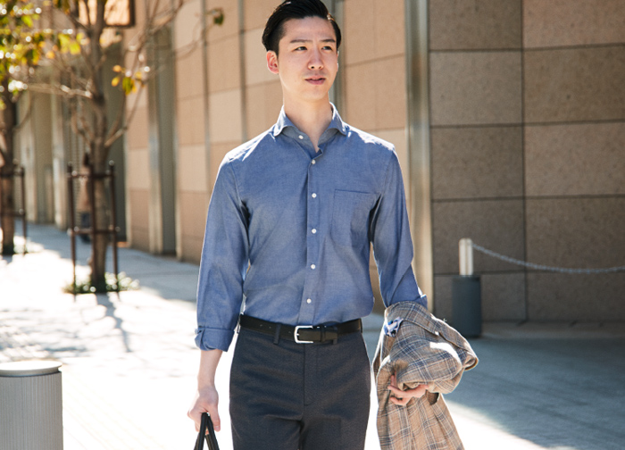 シャツの襟の開き角度が大きいカッタウェイカラーも、夏のシャツスタイルに便利です。しっかりと襟の開きがあるため、ノーネクタイでもだらしなく見えることがありません。長袖のシャツを腕まくりするのもクールビズならでは。