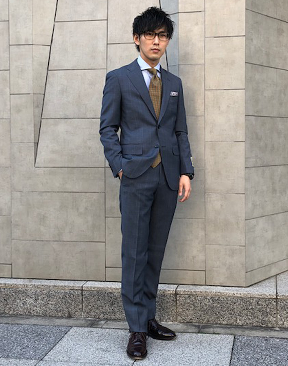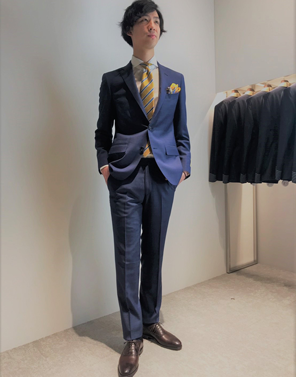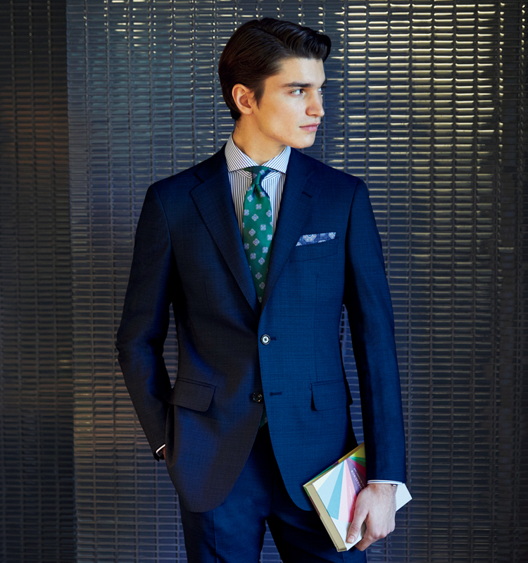 メランジ調のネイビーをベースに、ブルーのウインドーペーンを配したドラゴ社製スーパー130’Sウール生地は、トレンドのヴィンテージテイストを表現。ハリコシがあり、立体的で凛とした仕立て映えも魅力です。