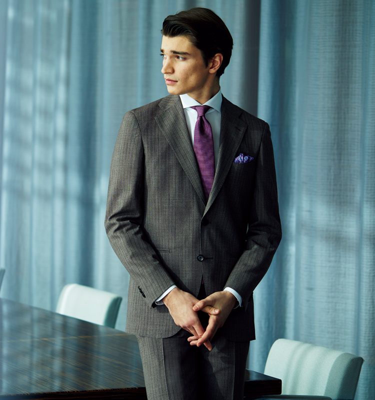 今季注目カラーのブラウン。メランジ調でややグレーがかったドラゴ社のスーパー130’Sウール生地は、ビジネスで採り入れやすい表情です。フラップレスポケットの「フィオレンティーナ」モデルでモダンさも加味。