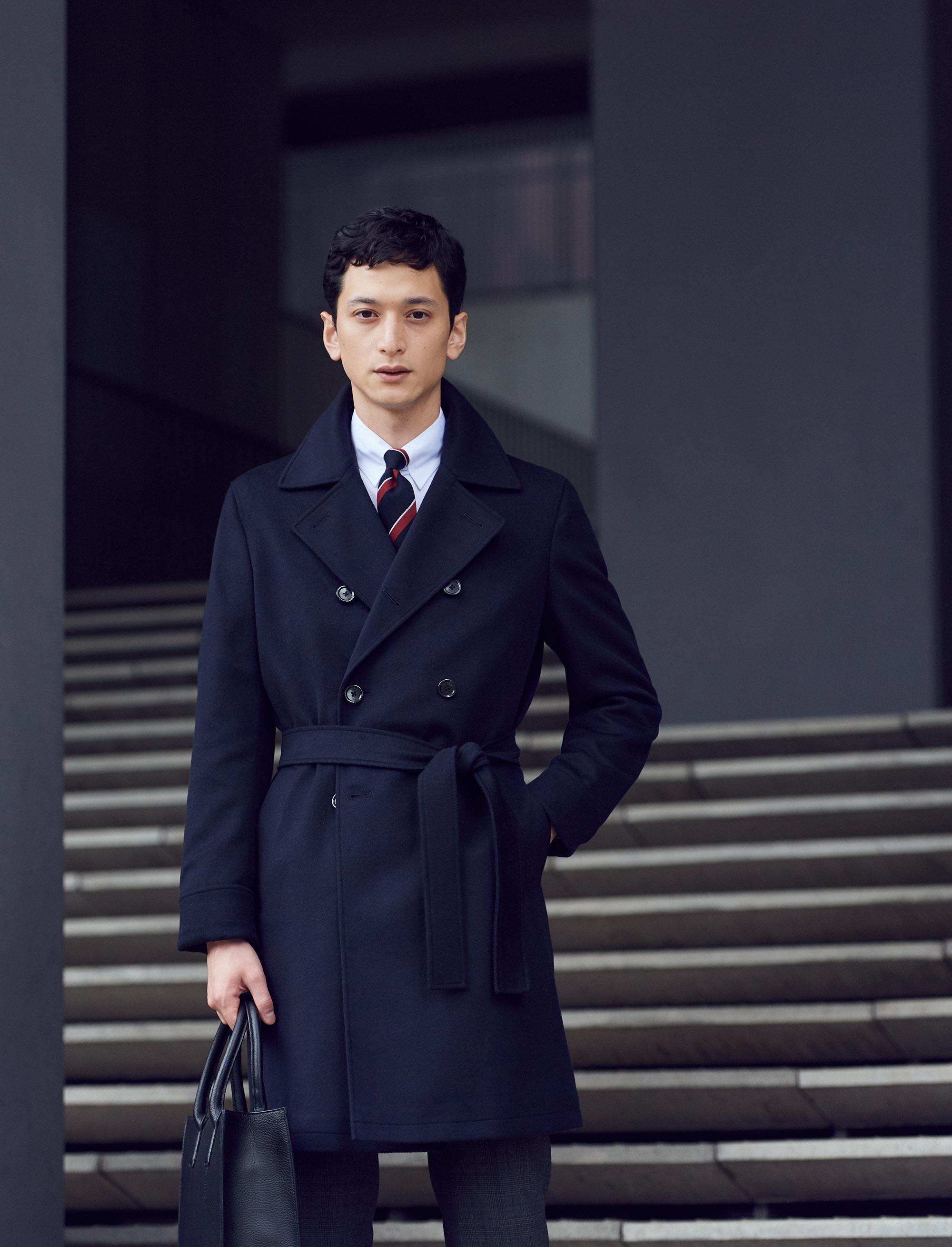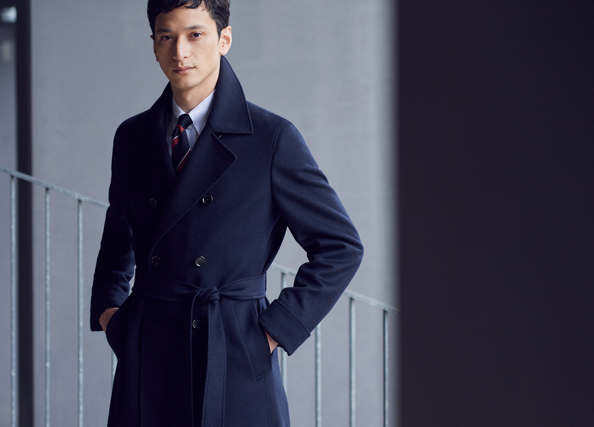 ビジネスシーンにふさわしい装いのなかで時代感を纏う。ネイビーのカシミア混素材をエレガントな長めの着丈に仕上げたダブルのベルテッドコートなら、今気になるマスキュリンなムードをあくまで品よく演出できます。
