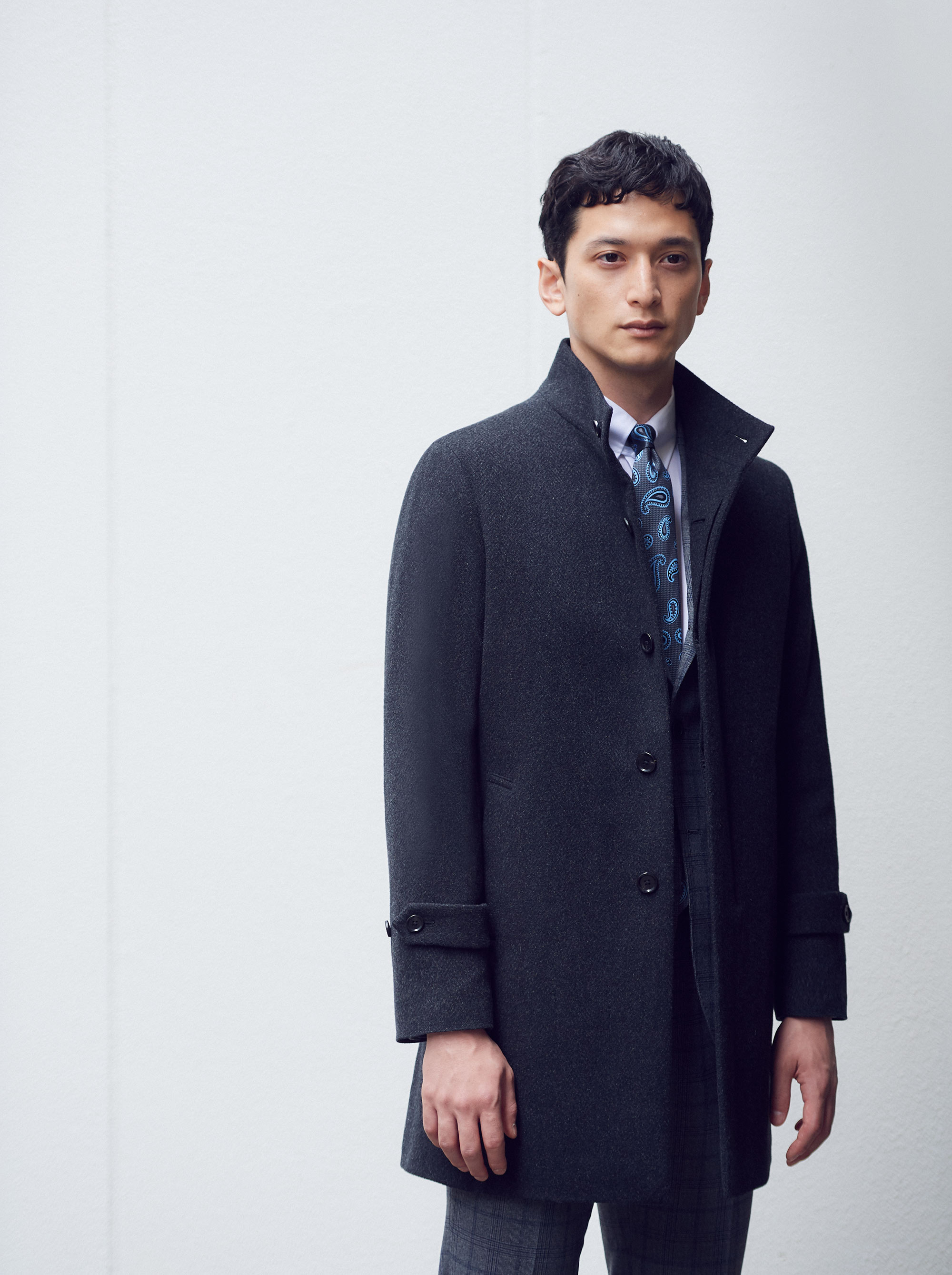 やわらかなタッチと軽さが魅力の上質なラムウールを用いたステンカラーコート。スーツの上から羽織るのにちょうどよく、なおかつスマートに見えるようサイズバランスを考え抜いた、中庸にして洗練された一着です。