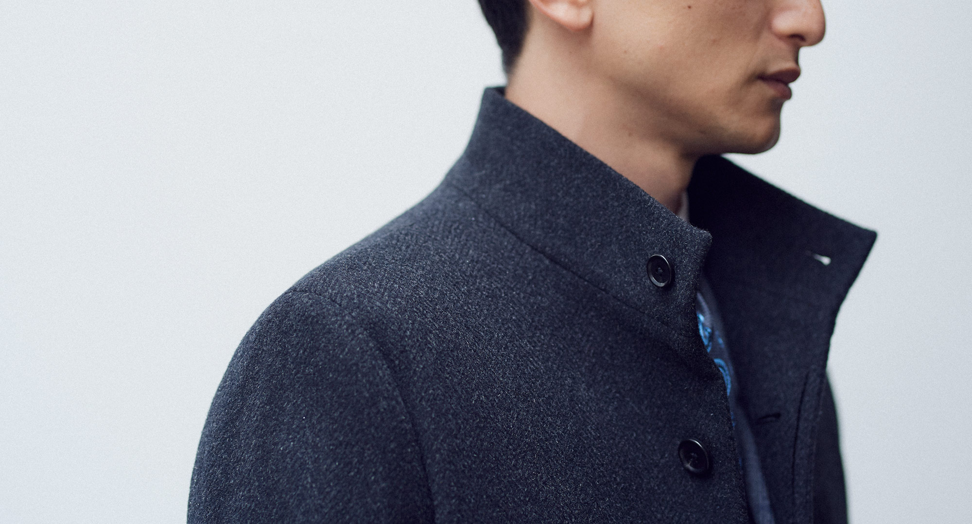 軽く、やわらかく、温かなアンゴラ入りの生地は、微かにクラシックが薫るダークトーンのヘリンボーン織り。デザインは、ただ着るだけで襟元がキマるスタンドカラー。クリーンで、シュッとスタイルよく見える一着です。