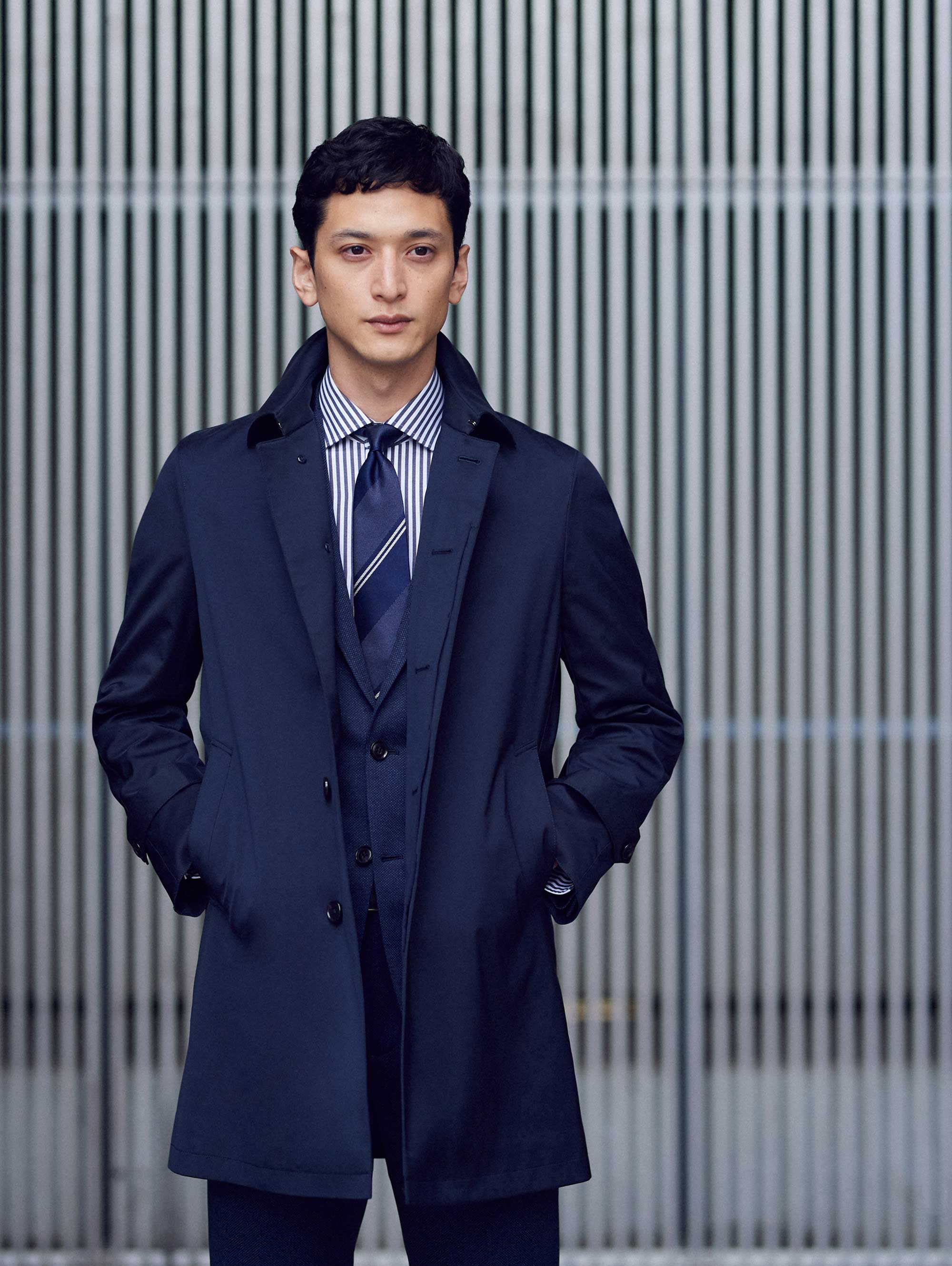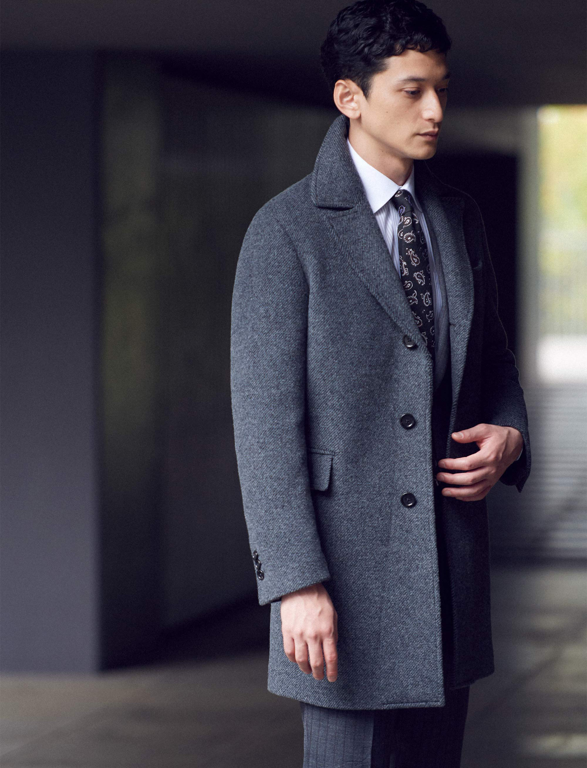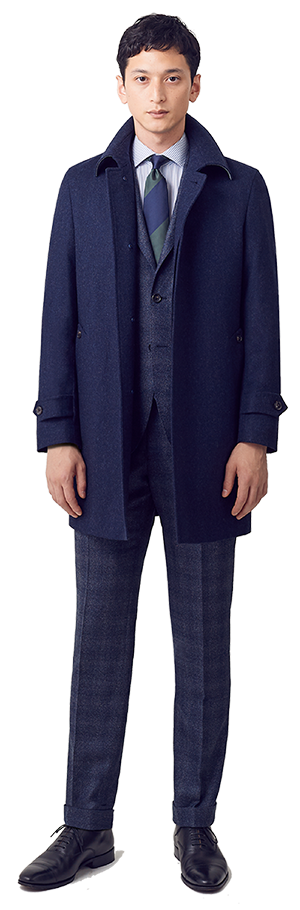 オンリーにとって最も大切なのは、働くオトコの装いの基本であるスーツスタイル。 だから、冬に欠かせないコートを考えるにあたっても、念頭にあるのは、 きちんとしたスーツにいかに似合うか、ということです。