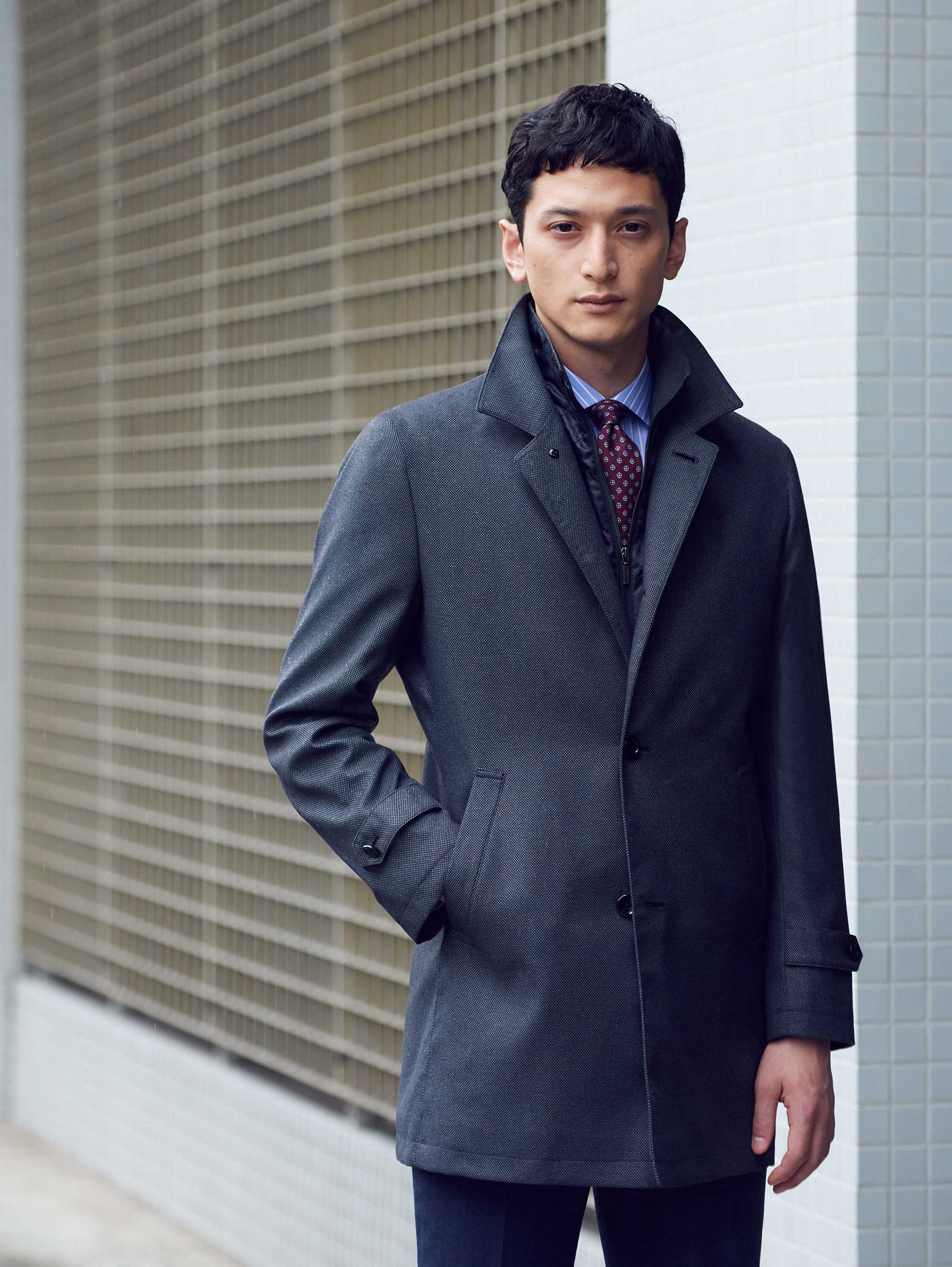 スタイリッシュかつ保温性の高いレイヤード風の着脱式ライナーを備えた2Wayコート。ライナーを外せば、ベーシックなステンカラー型に。シックなバーズアイ柄の生地は、実は撥水効果のある機能素材です。