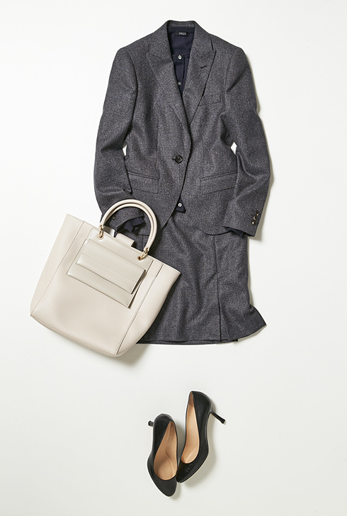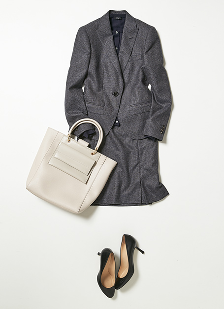 ボックスプリーツスカートで全体的にフェミニンなイメージを出しながら、落ち着いた生地でシャープな印象もアピールできる。