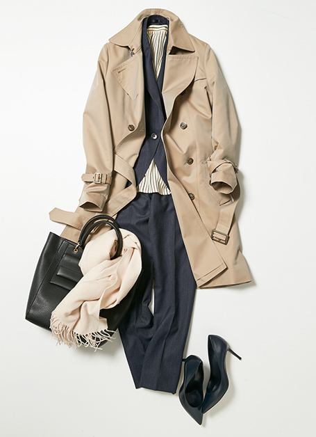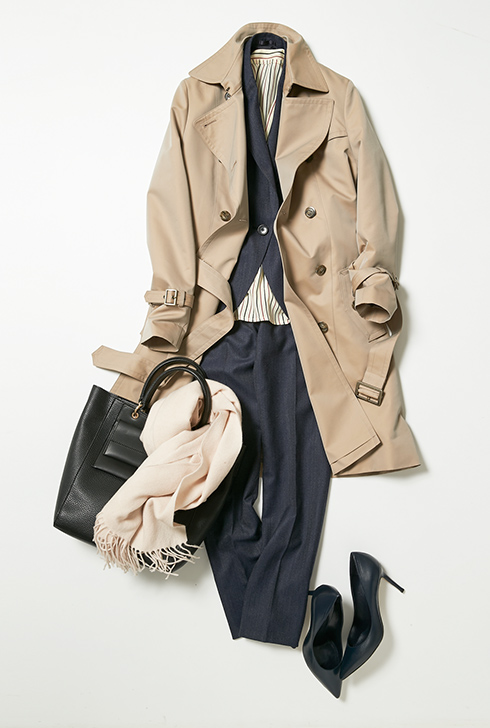 秋冬アイテムとして大活躍なベージュのトレンチコート。ストール・バックなど小物を工夫するだけでビジネスからカジュアルまで幅広く使い回しができる一着。