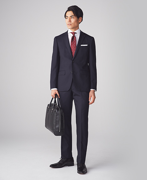 ビジネスシーンにおける定番柄の「ストライプ柄」。シャープな印象だけでなく、きちんとしたビジネスマンを演出することができます。中でもダークネイビーは社会人必須の一着。
