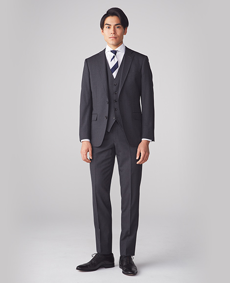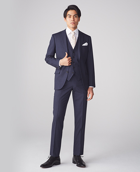 スタイリッシュな印象を与えるスリーピーススーツ。ビジネスシーンだけでなく、結婚式などあらゆる場面で活躍の幅が広がる一着です。
