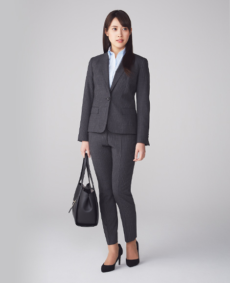 知的な印象のグレースーツは、クロップドパンツを合わせてこなれ感を。ストライプ柄はスタイルアップ効果があるのも嬉しいポイントです。
