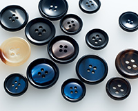 ボタンは生地と同系色にしたり、敢えてコントラストカラーにすることもできます。水牛やナットなど素材も様々です。
