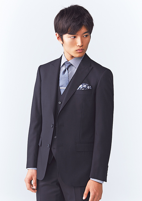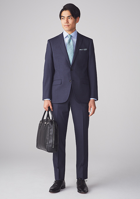 誠実な印象をもたらすネイビーは、爽やかでありながら、華やかさも兼備。ネイビーはコーディネートが決まりやすく、スーツ初心者にもオススメのカラーです。