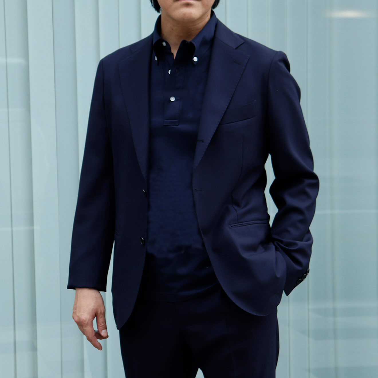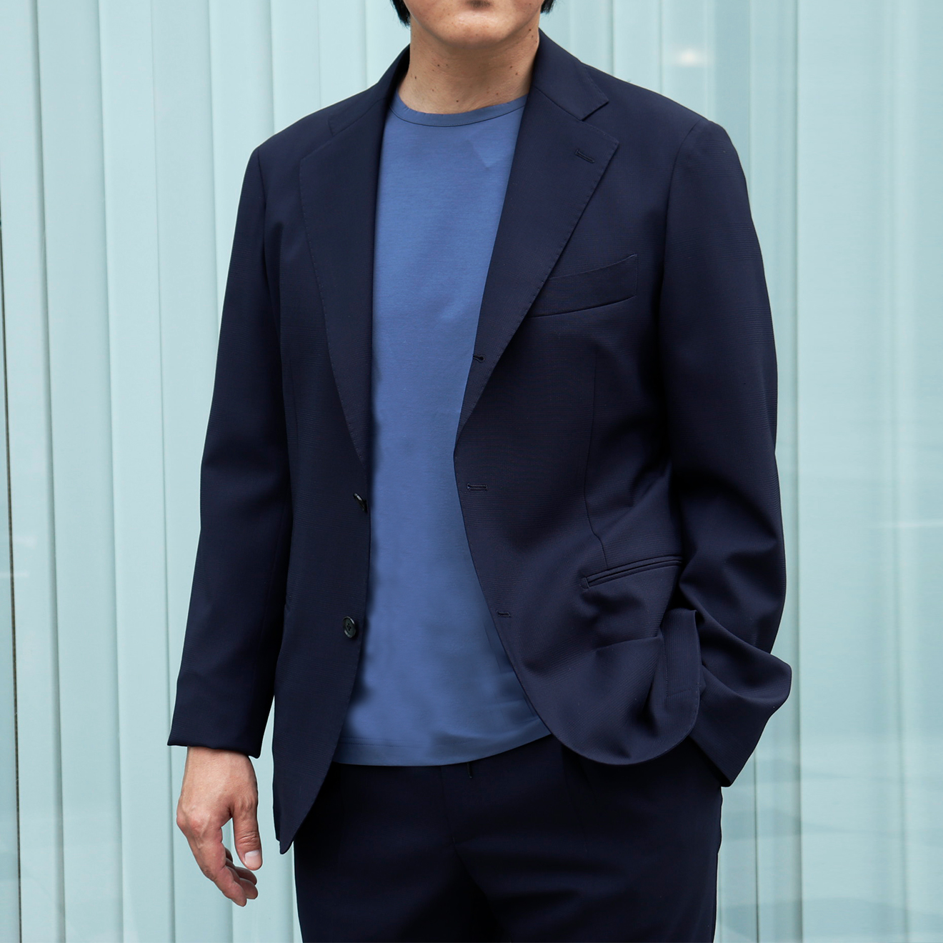 我々が一番にこだわったのは、ジャケットを羽織った時の着心地と、シワなどの見え感です。