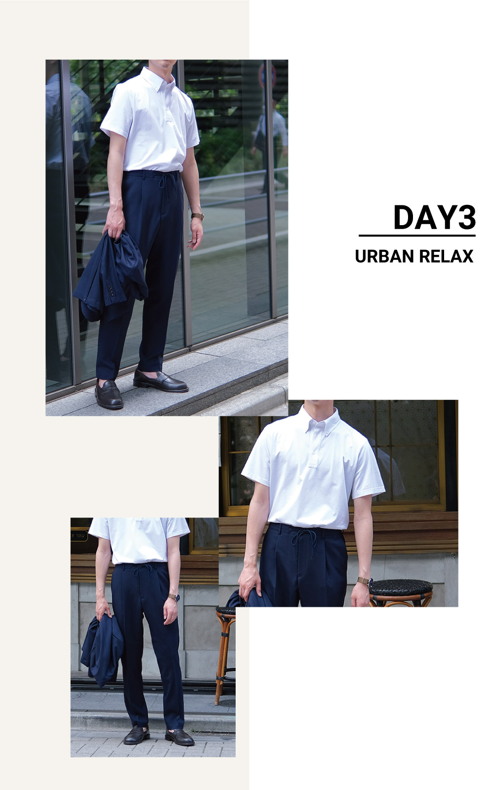 トップスには清潔感あるポロシャツに、汎用性抜群なネイビーのセットアップを。