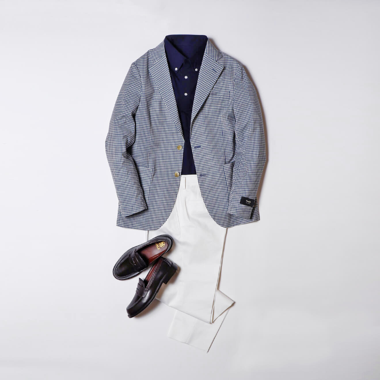 ブルーのギンガムチェックに白パンを合わせた夏らしいジャケットスタイル。
